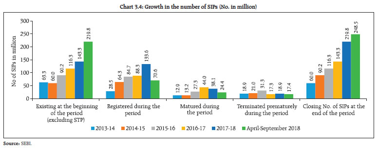 3.29 Notwithstanding the ebbs and flows in aggregate mobilisation of MFs, the Systematic Investment Plans (SIPs) remain a favoured choice for the investors (Chart 3.4). The net folio increase during April-September 2018 over 2017-18 was 2.88 million. Investments through SIPs in mutual funds appear to be relatively more stable from the point of view of sustainability of fund inflows. 3.30 Given the significant churn in MF flows, management of liquidity by MFs assume importance (Box 3.2). Box. 3.2 Framework for Liquidity Risk Management by MFs Mutual funds are redeemable on daily basis, which, under normal circumstances see orderly redemptions. However, under stressed market conditions, a fund must be ready to meet the redemption obligations to its unit-holders. In this context, liquidity management is very important for mutual funds and there must be adequate policies and procedures to meet investor redemption requests. SEBI has put in place various policy tools to mitigate / resolve liquidity issues in MF schemes: 1. Exit load: A fee calculated as a percentage of net asset value (NAV) is charged from an investor when units are redeemed within the period specified in the scheme’s offer document. This measure reduces the likelihood of withdrawals by investors from the mutual fund schemes within the specified period. 2. For better asset-liability match: Close ended debt schemes can invest only in such securities which mature on or before the date of the maturity of the scheme. Further, Liquid funds can invest only in instruments of up to 91-day maturity and Money Market Mutual Fund (MMMF) schemes can invest only in money market instruments with maturity less than one year. 3. Listing of close ended / interval schemes: To provide investors with an exit option and to give fund managers certainty in managing funds till the closing date, the regulatory framework was amended by mandating the listing of close ended and interval schemes. 4. Portfolio diversification norms: Investment limits are being placed on securities issued by a single issuer, sector exposure limit, group level limit and also limits on investments in listed securities issued by associate / group companies. 5. 20-25 rule: To reduce investors’ concentration, SEBI guidelines mandate that each scheme needs to have a minimum of 20 investors and no single investor shall account for more than 25 per cent of the corpus of the scheme. This reduces the likelihood of huge redemptions of a scheme’s units by a single/ few investors holding a substantial proportion of the scheme’s asset. 6. Adopting the principles of Fair Valuation: To ensure fair treatment to all investors, the overarching and overriding principles of fair valuation have been adopted as per which the valuation of investments shall be reflective of the realisable value of the securities/assets. Adopting such principal of fair valuation takes away the incentive from investors to redeem prior to other investors, thereby reducing the redemption pressure and ‘run’ on the scheme. 7. Mutual funds have also been provided with a period of 10 days, from date of redemption request, to provide redemption proceeds to investors. 8. Stress testing by AMCs: To evaluate potential vulnerabilities and take corrective actions thereof, stress testing has been made mandatory for all Liquid Fund and MMMF Schemes. The stress test is required to be carried out by the AMC at least on a monthly basis and should test the impact of interest rate risk, credit risk and liquidity and redemption risk, among others deemed necessary, on the NAV of the concerned schemes. 9. Limits on investment in illiquid assets: To limit investments in illiquid assets, aggregate value of any scheme’s investments in ‘illiquid securities’, which are defined as non-traded, thinly traded and unlisted equity shares, should not exceed 15 per cent of the total assets of the scheme and any illiquid securities held above 15 per cent of the total assets will be assigned zero value. 10. Borrowing by MFs: To meet temporary liquidity requirements of the Mutual Funds for the purpose of repurchase, redemption of units or payment of interest or dividend to the unit-holders, MFs have been permitted to borrow to the extent of 20 per cent of the net asset of the scheme and the duration of such a borrowing shall not exceed a period of 6 months. 11. Restrictions on redemptions: In order to protect the interest of the investors, SEBI vide its circular dated May 31, 2016 has provided guidelines on restrictions on redemptions. The following should be observed before imposing restrictions on redemptions: a. Restrictions may be imposed when there are circumstances leading to a systemic crisis or event that severely constricts market liquidity or the efficient functioning of markets such as: i. Liquidity issues - when the market at large becomes illiquid affecting almost all securities rather than any issuer specific security. Further, restriction on redemption due to illiquidity of a specific security in the portfolio of a scheme due to a poor investment decision, is not allowed. ii. Market failures, exchange closures - when markets are affected by unexpected events which impact the functioning of exchanges or the regular course of transactions. iii. Operational issues – when exceptional circumstances are caused by force majeure, unpredictable operational problems and technical failures (for example a black out). b. Restrictions on redemptions can be imposed for a specified period of time not exceeding 10 working days in any 90 days period. c. Any imposition of restrictions requires specific approval of board of AMCs and Trustees and SEBI should be informed immediately about this. d. When restrictions on redemptions are imposed, the following procedure shall be applied: i. All redemption requests up to ₹0.20 million will not be subject to such restriction. ii. Where redemption requests are above ₹0.20 million, AMCs shall red