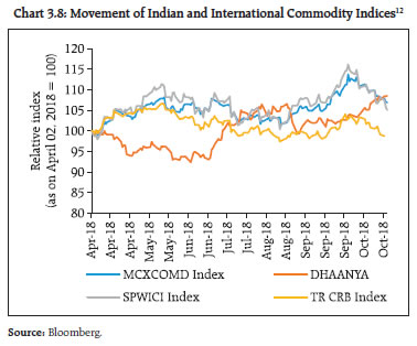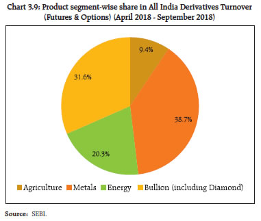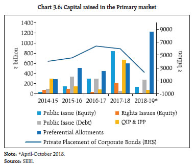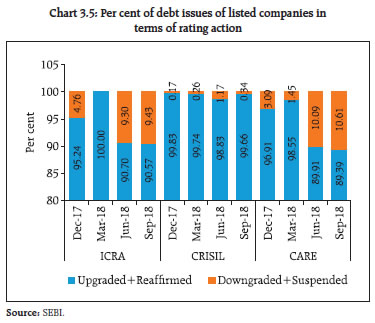 III. Trends in capital raised – debt and equity – emerging issues a. Credit ratings and framework for their role and accountability A. Trend in rating movements 3.31 An analysis of the credit ratings of debt issues of listed companies by major Credit Rating Agencies (CRAs) in India shows that there was a surge in the share of downgraded/ suspended companies of two rating agencies during the June and September 2018 quarters (Chart 3.5). B. Further strengthening of the CRA framework 3.32 In order to further strengthen the rating framework, SEBI, in May 2018, issued guidelines with respect to the process for review of ratings. Pursuant to the circular, based on the representations received from the market participants, further modifications were made to the framework. It was decided that requests by an issuer for review of the rating(s) provided to its instrument(s) will be reviewed by a rating committee of the CRA that will consist of majority of whose members are different from those in the Rating Committee that assigned the earlier rating, and at least one-third of the members will be independent. Further, to make the disclosures more relevant, CRAs were directed to disclose all the ratings which were not accepted by an issuer, on their website, for a period of 12 months from the date of such ratings being disclosed as a non-accepted rating. 3.33 In June 2018 SEBI directed that CRAs may withdraw a rating subject to CRA having (i) rated the instrument continuously for 5 years or 50 per cent of the tenure of the instrument, whichever is higher and (ii) received an undertaking from the issuer that a rating is available on that instrument. Further, at the time of withdrawal, the CRA shall assign a rating to such instrument and issue a press release regarding the rating. Vide SEBI (Credit Rating Agencies) (Amendment) Regulations, 2018, notified on May 30, 2018, SEBI put in place various criteria on enhanced net worth of the CRA, minimum shareholding of the promoter with lock-in requirement, restrictions on cross-holdings among CRAs and restrictions on carrying out any activity other than the rating of securities offered by way of public or rights issue with certain carve-outs. 3.34 SEBI also overhauled the disclosures by CRAs recently. The enhanced disclosures pertain to parent / group/government support, liquidity position (including forward looking measures for non-banks like unutilised credit lines and adequacy of cash flows for servicing maturing debt obligation, etc.). The enhanced disclosure regime significantly enhances the information content of the rating. C. Primary market issuance trends in FY 2018-19 3.35 During April-September 2018, ₹274.45 billion was raised through 12 public issues in bond market. More than ₹2 trillion was also raised through private placement of corporate bonds during the same period (Chart 3.6). The major issuers of corporate bonds were body corporates and NBFCs accounting for more than 50 per cent of the outstanding corporate bonds as on September 2018 (Chart 3.7a) whereas body corporates and mutual funds were the major subscribers of the same (Chart 3.7b). With regard to equity capital ₹149.70 billion has been raised during April-October 2018 (Chart 3.6). IV. Commodity Derivatives (a) Risk Management and Surveillance of Commodity Derivative Markets 3.36 SEBI took over the regulation of commodity derivatives market from September 28, 2015. To streamline and ensure the smooth functioning of commodities futures markets, SEBI has put in place a comprehensive risk management and surveillance framework for National Commodity Derivative Exchanges in October 2015 and prescribed additional risk management norms for commodity National Exchanges in September 2016. 3.37 In 2014, SEBI had issued norms related to the Core Settlement Guarantee Fund, default waterfall, stress testing, back testing etc. for recognised Clearing Corporations. These norms have been made applicable to Clearing Corporations clearing commodity derivatives transactions as well. Inter-alia, Minimum Required Corpus of Core Settlement Guarantee Fund (MRC) for the commodity derivatives segment of any stock exchange has been stipulated at ₹100 million and modified standardised stress testing scenarios and methodology has been prescribed for carrying out daily stress testing for credit risk for commodity derivatives. Risk management framework and product design guidelines were issued for trading in options on commodity futures. At present, Multi Commodity Exchange of India Ltd. (MCX) is offering Options trading in Gold Futures, Crude oil futures, Copper futures, Silver Futures and Zinc futures. The National Commodity & Derivatives Exchange Ltd. (NCDEX) is offering Options trading in Guar Seed futures, Guar Gum futures, Chana futures, Soybean futures and Refined Soy Oil futures.  3.38 In addition, SEBI has been taking various measures to further strengthen the surveillance and integrity of commodity derivatives markets. Some of the important measures taken by SEBI during 2018-19 (up to October 24, 2018) includes: monthly surveillance meetings with commodity exchanges, surprise warehouse visits, visits to physical markets of commodities traded at the exchange, meeting various traders and value chain participants to take their feedback and collect surveillance inputs for further policy measures, inspections of commodity derivatives exchanges, imposition of special margins, Self-Trades Prevention check at permanent account number level by exchanges to restrict wash/ self-trades at exchanges platform, increased penalty (up to 100 per cent of the profit/loss booked) in case of reversal of trades, etc. (b) Market developments 3.39 As on October 31, 2018, the benchmark indices, MCX COMDEX increased by 6.8 per cent and NCDEX Dhaanya increased by 10.3 per cent over March 31, 2018. During the same period, while the S&P World Commodity Index increased by 5.1 per cent, Thomson Reuters CRB Index decreased