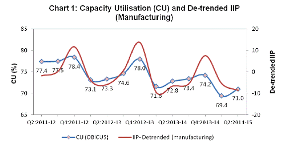 Capacity Utilisation (CU): There is broad co-movement between capacity utilisation and de-trended Index of Industrial Production (IIP)-manufacturing (Chart 1). Aggregate CU recorded a rise in Q2:2014-15 over the previous quarter. However, it stood at a level lower than its level a year ago (Table 1).