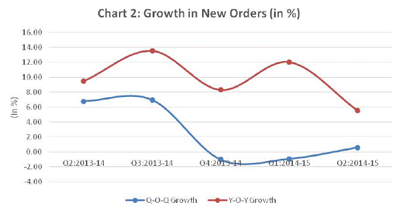Order Books: The new orders declined in Q2:2014-15 on a year-on-year basis and grew at lower rate of 5.6 per cent compared to previous quarters (Chart 2).