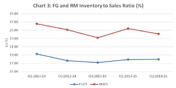 Inventory to Sales Ratio: The finished goods inventory to sales ratio remained flat in Q2:2014-15 and stood at 18.0 per cent, down from its level of the same quarter of the previous year (Chart 3). The raw material inventory to sales ratio declined in Q2:2014-15 on both q-o-q and y-o-y basis.