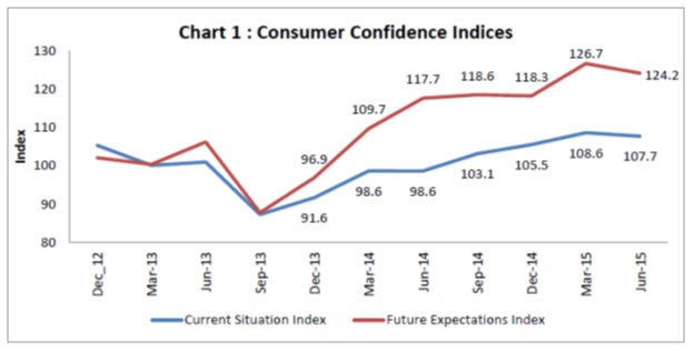 The Consumer Confidence Survey provides an assessment of the perceptions of respondents on general economic conditions and own financial situation during the current period and a year ahead. The survey captures qualitative information on a 3- point scale i.e., improve, remain same or worsen, from respondents spread across six metropolitan cities viz,. Bengaluru, Chennai, Hyderabad, Kolkata, Mumbai and New Delhi. The information so collected is analysed in two parts- current situation as compared with a year ago and the expectations for a year ahead. The Survey was conducted during the second to third week of June 2015. Salient findings of the survey based on the responses of around 5,400 respondents are presented below. Highlights: I. Consumer perception on the general economic conditions for the current period and the year ahead continues to be positive. Both Current Situation Index (CSI) and Future Expectations Index (FEI), which had steadily risen since September 2013 quarter, remained well above 100. However the level of CSI and FEI declined marginally in the current round on account of moderation in sentiment on all the indicators, excepting perceptions on spending. II. Net responses on current as well as future economic conditions moderated by about 2-3 percentage points in June 2015 round. However, the proportion of respondents reporting improvement on current as well as future economic conditions continued its upward movement since December 2014 quarter (Table 1). III. The positive perceptions regarding current income appear to be declining from September 2014 onwards. The net responses on income in current period as well as for 1-year ahead period have recorded a fall in June 2015 round (Table 2). IV. The net responses on current spending as well as future spending increased by around 10 percentage points each and were above 80 per cent in June 2015 round (Table 3). On future spending, more than 86 per cent respondents expect an increase in 1-year ahead period (Table 3). V. With regard to perceptions relating to spending on essential items, more than 87 per cent respondents reported increase for the current as well as future period. Further, during the current round of survey, proportions of respondents reporting increase in current and future perceptions on non-essential spending, also showed increase as compared to the previous round, and stood at around 47 per cent and 52 per cent, respectively. VI. Current assessment and outlook on employment continued to decline in this round as well and the corresponding net responses declined by about 6 percentage points each compared to previous round of survey (Table 4). VII. There was no improvement in perceptions observed in this round of survey regarding price levels and inflation (Tables 5 and 6). | Table 1: Perceptions on Economic Conditions | | (Percentage responses) | | | Compared with 1-year ago | 1-year ahead | | Sep-14 | Dec-14 | Mar-15 | Jun-15 | Sep-14 | Dec-14 | Mar-15 | Jun-15 | | Improve | 29.3 | 30.2 | 41.7 | 43.1 | 54.8 | 50.9 | 56.8 | 57.6 | | Remain same | 32.1 | 41.2 | 32.4 | 27.8 | 28.1 | 32.3 | 26.8 | 22.3 | | Worsen | 38.7 | 28.6 | 25.9 | 29.1 | 17.1 | 16.8 | 16.4 | 20.2 | | Net Response | -9.4 | 1.6 | 15.8 | 14.0 | 37.7 | 34.1 | 40.4 | 37.4 | | Table 2: Perceptions on Income | | (Percentage responses) | | | Compared with 1-year ago | 1-year ahead | | Sep-14 | Dec-14 | Mar-15 | Jun-15 | Sep-14 | Dec-14 | Mar-15 | Jun-15 | | Increase | 47.2 | 38.7 | 35.4 | 34.9 | 67.0 | 59.8 | 55.4 | 52.7 | | Remain same | 38.4 | 48.0 | 46.1 | 43.7 | 27.8 | 35.1 | 35.5 | 35.6 | | Decrease | 14.4 | 13.2 | 18.5 | 21.4 | 5.1 | 5.1 | 9.1 | 11.6 | | Net Response | 32.7 | 25.5 | 16.9 | 13.6 | 61.9 | 54.7 | 46.3 | 41.1 | | Table 3: Perceptions on Spending | | (Percentage responses) | | | Compared with 1-year ago | 1-year ahead | | Sep-14 | Dec-14 | Mar-15 | Jun-15 | Sep-14 | Dec-14 | Mar-15 | Jun-15 | | Increase | 78.1 | 75.7 | 80.0 | 87.4 | 41.9 | 35.6 | 78.3 | 86.2 | | Remain same | 18.2 | 20.0 | 13.7 | 9.5 | 28.6 | 35.3 | 15.8 | 9.6 | | Decrease | 3.8 | 4.3 | 6.3 | 3.1 | 29.5 | 29.2 | 6.0 | 4.2 | | Net Response | 74.3 | 71.4 | 73.7 | 84.4 | 12.4 | 6.4 | 72.3 | 82.0 | | Table 4: Perceptions on Employment | | (Percentage responses) | | | Compared with 1-year ago | 1-year ahead | | Sep-14 | Dec-14 | Mar-15 | Jun-15 | Sep-14 | Dec-14 | Mar-15 | Jun-15 | | Improve | 36.0 | 36.1 | 37.6 | 36.0 | 61.4 | 61.1 | 55.8 | 53.7 | | Remain Same | 35.3 | 39.7 | 35.3 | 32.2 | 29.0 | 29.7 | 28.7 | 26.9 | | Worsen | 28.7 | 24.1 | 27.2 | 31.8 | 9.5 | 9.3 | 15.5 | 19.4 | | Net Response | 7.3 | 12.0 | 10.4 | 4.2 | 51.9 | 51.8 | 40.3 | 34.4 | | Table 5: Perceptions on price level | | (Percentage responses) | | Compared with 1-year ago | 1-year ahead | | Sep-14 | Dec-14 | Mar-15 | Jun-15 | Sep-14 | Dec-14 | Mar-15 | Jun-15 | | Increase | 92.1 | 85.1 | 78.8 | 84.3 | 77.6 | 66.7 | 73.9 | 82.3 | | Remain same | 5.1 | 12.6 | 16.0 | 9.1 | 15.8 | 22.2 | 17.7 | 9.1 | | Decrease | 2.8 | 2.3 | 5.2 | 6.6 | 6.6 | 11.1 | 8.4 | 8.5 | | Net Response | -89.2 | -82.8 | -73.6 | -77.6 | -71.0 | -55.6 | -65.5 | -73.8 | | Note: Perceptions of increase in prices is considered to be negative sentiments and decrease in prices is considered to be positive sentiments. The net responses are therefore, negative. | | Table 6: Perceptions on rate of change in price levels (Inflation) | | (Percentage responses) | | Compared with 1-year ago | 1-year ahead | | Sep-14 | Dec-14 | Mar-15 | Jun-15 | Sep-14 | Dec-14 | Mar-15 | Jun-15 | | Increase | 88.2 | 81.9 | 82.5 | 87.9 | 85.9 | 81.0 | 83.5 | 83.8 | | Remain Same | 10.2 | 15.9 | 13.7 | 9.7 | 13.1 | 16.9 | 12.7 | 12.9 | | Decrease | 1.6 | 2.2 | 3.8 | 2.4 | 1.1 | 2.1 | 3.7 | 3.3 | | Net Response | -86.6 | -79.8 | -78.7 | -85.5 | -84.8 | -78.8 | -79.8 | -80.5 | |