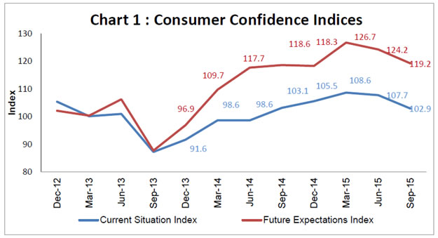 The Consumer Confidence Survey provides an assessment of perceptions of respondents on general economic conditions and their own situation during the current period and a year ahead. The survey captures qualitative perceptions on a three-point scale i.e., improve, remain same or worsen, from respondents spread across six metropolitan cities viz. Bengaluru, Chennai, Hyderabad, Kolkata, Mumbai and New Delhi. The information so collected is analysed in two parts – current situation as compared with a year ago and the expectations for a year ahead. The salient findings of the survey, based on the responses of around 5,200 respondents are presented below. Highlights: I. Both Current Situation Index (CSI) and Future Expectations Index (FEI) moderated further in the current round as compared to June 2015 round with lower level of optimism in all the parameters, with the exception of perceptions on price level. II. Net responses on current as well as future economic conditions decreased as compared to June 2015 round. Moreover, the proportion of respondents reporting improvement in current as well as future economic conditions, which depicted an upward movement since December 2014, declined in September 2015. This was on account of higher proportion of respondents reporting their views on current as well as future economic conditions remaining the same (Table 1). III. The positive perceptions regarding income, for current and one year ahead periods, exhibited a fall of about 5 percentage points in September 2015, continuing the declining trend seen since September 2014 (Table 2). IV. The net responses on current as well as future spending, which were above 80 per cent in June 2015, reached a lower level of about 73 per cent in September 2015 (Table 3). V. As regards perceptions relating to spending on essential items, more than 80 per cent respondents reported increase for the current as well as future period. Further, the proportion of respondents who reported increase in spending on non-essential items declined as compared to June 2015 for both current and one year ahead periods (Tables 4 and 5). VI. Employment outlook worsened in this round as compared to previous round of the survey and net response for the current period reached negative zone albeit marginally. However, about one-half (47 per cent) respondents expected improvement in employment situation one year ahead (Table 6). VII. As regards price levels and inflation, current sentiments and future expectations showed improvement in this round of survey (Tables 7 and 8). | Table 1: Perceptions on Economic Conditions | | (Percentage responses) | | | Compared with 1-year ago | 1-year ahead | | Dec-14 | Mar-15 | Jun-15 | Sep-15 | Dec-14 | Mar-15 | Jun-15 | Sep-15 | | Improve | 30.2 | 41.7 | 43.1 | 36.5 | 50.9 | 56.8 | 57.6 | 47.7 | | Remain same | 41.2 | 32.4 | 27.8 | 32.7 | 32.3 | 26.8 | 22.3 | 32.1 | | Worsen | 28.6 | 25.9 | 29.1 | 30.9 | 16.8 | 16.4 | 20.2 | 20.3 | | Net Response | 1.6 | 15.8 | 14.0 | 5.6 | 34.1 | 40.4 | 37.4 | 27.4 | | Table 2: Perceptions on Income | | (Percentage responses) | | | Compared with 1-year ago | 1-year ahead | | Dec-14 | Mar-15 | Jun-15 | Sep-15 | Dec-14 | Mar-15 | Jun-15 | Sep-15 | | Increase | 38.7 | 35.4 | 34.9 | 29.1 | 59.8 | 55.4 | 52.7 | 47.1 | | Remain same | 48.0 | 46.1 | 43.7 | 50.4 | 35.1 | 35.5 | 35.6 | 42.4 | | Decrease | 13.2 | 18.5 | 21.4 | 20.5 | 5.1 | 9.1 | 11.6 | 10.5 | | Net Response | 25.5 | 16.9 | 13.6 | 8.6 | 54.7 | 46.3 | 41.1 | 36.6 | | Table 3: Perceptions on Spending | | (Percentage responses) | | | Compared with 1-year ago | 1-year ahead | | Dec-14 | Mar-15 | Jun-15 | Sep-15 | Dec-14 | Mar-15 | Jun-15 | Sep-15 | | Increase | 75.7 | 80.0 | 87.4 | 81.0 | 35.6 | 78.3 | 86.2 | 80.9 | | Remain same | 20.0 | 13.7 | 9.5 | 10.7 | 35.3 | 15.8 | 9.6 | 11.2 | | Decrease | 4.3 | 6.3 | 3.1 | 8.2 | 29.2 | 6.0 | 4.2 | 7.9 | | Net Response | 71.4 | 73.7 | 84.4 | 72.8 | 6.4 | 72.3 | 82.0 | 73.0 | | Table 4: Perceptions on Spending-Essential Items | | (Percentage responses) | | | Compared with 1-year ago | 1-year ahead | | | Mar-15 | Jun-15 | Sep-15 | Mar-15 | Jun-15 | Sep-15 | | Increase | 85.7 | 91.8 | 82.0 | 80.5 | 87.0 | 80.1 | | Remain same | 10.9 | 6.1 | 9.7 | 14.4 | 8.8 | 11.6 | | Decrease | 3.4 | 2.1 | 8.4 | 5.2 | 4.2 | 8.3 | | Net Response | 82.3 | 89.7 | 73.6 | 75.3 | 82.8 | 71.9 | | Table 5: Perceptions on Spending-Non-Essential Items | | (Percentage responses) | | | Compared with 1-year ago | 1-year ahead | | | Mar-15 | Jun-15 | Sep-15 | Mar-15 | Jun-15 | Sep-15 | | Increase | 41.9 | 46.9 | 41.2 | 43.6 | 52.3 | 44.0 | | Remain same | 28.4 | 25.5 | 35.0 | 28.7 | 24.3 | 34.2 | | Decrease | 29.7 | 27.6 | 23.8 | 27.7 | 23.4 | 21.8 | | Net Response | 12.2 | 19.3 | 17.4 | 15.9 | 28.9 | 22.2 | | Table 6: Perceptions on Employment | | (Percentage responses) | | | Compared with 1-year ago | 1-year ahead | | | Dec-14 | Mar-15 | Jun-15 | Sep-15 | Dec-14 | Mar-15 | Jun-15 | Sep-15 | | Improve | 36.1 | 37.6 | 36.0 | 31.9 | 61.1 | 55.8 | 53.7 | 47.1 | | Remain Same | 39.7 | 35.3 | 32.2 | 34.8 | 29.7 | 28.7 | 26.9 | 33.4 | | Worsen | 24.1 | 27.2 | 31.8 | 33.3 | 9.3 | 15.5 | 19.4 | 19.5 | | Net Response | 12.0 | 10.4 | 4.2 | -1.4 | 51.8 | 40.3 | 34.4 | 27.6 | | Table 7: Perceptions on Price Level | | (Percentage responses) | | Compared with 1-year ago | 1-year ahead | | Dec-14 | Mar-15 | Jun-15 | Sep-15 | Dec-14 | Mar-15 | Jun-15 | Sep-15 | | Increase | 85.1 | 78.8 | 84.3 | 80.9 | 66.7 | 73.9 | 82.3 | 78.0 | | Remain same | 12.6 | 16.0 | 9.1 | 9.4 | 22.2 | 17.7 | 9.1 | 12.4 | | Decrease | 2.3 | 5.2 | 6.6 | 9.8 | 11.1 | 8.4 | 8.5 | 9.5 | | Net Response | -82.8 | -73.6 | -77.6 | -71.1 | -55.6 | -65.5 | -73.8 | -68.5 | | Note: Perceptions of increase in prices and inflation are considered to be negative sentiments and decrease in pricesand inflation are considered to be positive sentiments. The net responses are therefore, negative. | | Table 8: Perceptions on rate of change in Price Levels (Inflation) 