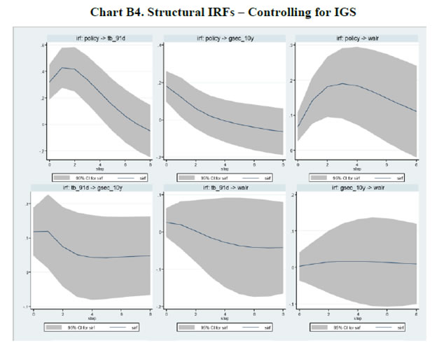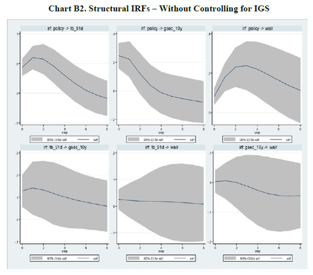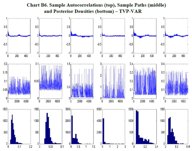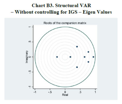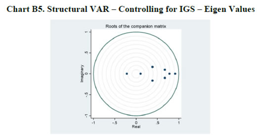 | Table B2. Structural VAR – Controlling for IGS – Lagrange Multiplier Test | | Lag | Chi-Sq | df | Sig. | | 1 | 12.503 | 16 | 0.709 | | 2 | 22.037 | 16 | 0.142 | | 3 | 14.355 | 16 | 0.572 | | 4 | 17.619 | 16 | 0.347 | | 5 | 13.020 | 16 | 0.671 | | 6 | 16.719 | 16 | 0.404 | | 7 | 13.581 | 16 | 0.630 | | 8 | 31.217 | 16 | 0.013 | | Table B3. Estimation Results of Selected Parameters in the TVP-VAR Model22 | | Parameter | Mean | Stdev | 95%U | 95%L | Geweke | Inef. | | sb1 | 0.210 | 0.035 | 0.160 | 0.302 | 0.931 | 5.570 | | sb2 | 0.194 | 0.023 | 0.160 | 0.263 | 0.787 | 4.690 | | sa1 | 0.419 | 0.165 | 0.215 | 0.733 | 0.922 | 31.780 | | sa2 | 0.350 | 0.173 | 0.234 | 0.903 | 0.923 | 8.170 | | sh1 | 0.313 | 0.097 | 0.208 | 0.535 | 0.913 | 9.510 | | sh2 | 0.315 | 0.065 | 0.207 | 0.452 | 0.962 | 1.930 |