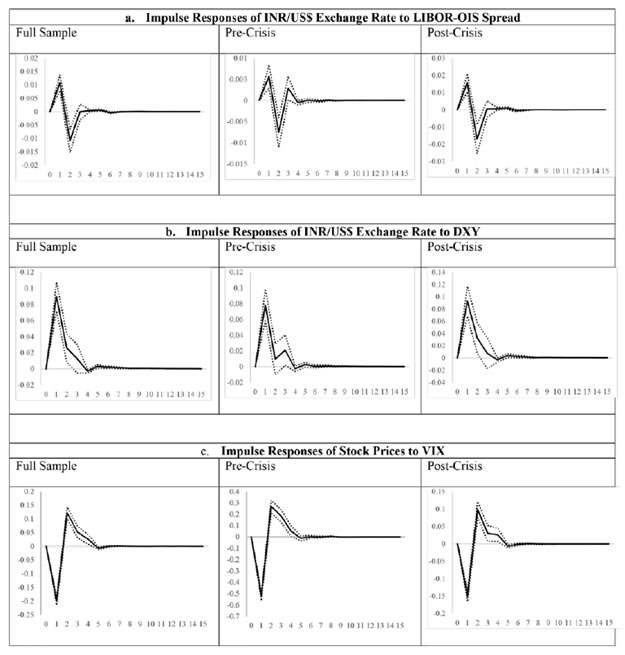 | Table A3.a: Spillover Impact in Foreign Exchange Market | | | Full Sample | Pre-Crisis | Post-Crisis | | | Mean Equation | | Dependent Variable: DINR Constant | 0.00 | -(0.39) | 0.00 | (0.21) | 0.00 | (0.34) | | DINR t-1 | 0.01 | (0.29) | -0.01 | -(0.18) | 0.01 | (0.48) | | DINR t-2 | -0.01 | -(0.72) | 0.02 | (0.73) | -0.04 | -(1.83) * | | DINR t-3 | -0.02 | -(1.32) | -0.06 | -(2.14) ** | -0.01 | -(0.55) | | DINR t-4 | 0.00 | (0.20) | -0.06 | -(1.88) * | 0.02 | (0.89) | | NFII t-1 | -0.01 | -(0.42) | -0.02 | -(0.45) | -0.01 | -(0.35) | | NFII t-2 | -0.07 | -(2.36) ** | -0.10 | -(1.90) * | -0.01 | -(0.30) | | NFII t-3 | -0.04 | -(1.40) | -0.08 | -(1.46) | -0.03 | -(0.89) | | NFII t-4 | 0.03 | (0.98) | 0.09 | (1.84) * | -0.03 | -(0.70) | | LIBOR_OIS t-1 | 0.00 | (1.65) * | 0.00 | -(0.16) | 0.00 | (1.71) * | | Dependent Variable: NFII Constant | 0.03 | (6.39) *** | 0.02 | (4.38) *** | 0.07 | (9.50) *** | | DINR t-1 | -0.06 | -(8.39) *** | -0.04 | -(2.96) *** | -0.07 | -(7.14) *** | | DINR t-2 | -0.02 | -(2.52) ** | -0.02 | -(1.33) | -0.03 | -(3.49) *** | | DINR t-3 | 0.00 | (0.08) | -0.01 | -(0.61) | -0.02 | -(2.01) ** | | DINR t-4 | -0.01 | -(0.97) | 0.00 | (0.29) | -0.02 | -(2.39) ** | | NFII t-1 | 0.25 | (10.53) *** | 0.33 | (10.21) *** | 0.29 | (10.31) *** | | NFII t-2 | 0.14 | (6.32) *** | 0.02 | (0.53) | 0.14 | (5.45) *** | | NFII t-3 | 0.09 | (4.25) *** | 0.12 | (3.52) *** | 0.09 | (3.93) *** | | NFII t-4 | 0.09 | (4.87) *** | 0.08 | (2.48) ** | 0.06 | (2.96) *** | | LIBOR_OIS t-1 | 0.00 | -(2.09) ** | 0.00 | -(1.72) * | 0.00 | -(3.56) *** | | | Variance Equation | | A(1,1) | 0.29 | (16.93) *** | 0.47 | (11.84) *** | 0.22 | (12.17) *** | | A(1,2) | 0.00 | -(0.30) | -0.01 | -(0.76) | 0.01 | (0.46) | | A(2,1) | -0.04 | -(2.22) ** | 0.00 | (0.01) | -0.08 | -(1.60) | | A(2,2) | 0.25 | (18.51) *** | 0.31 | (13.75) *** | 0.50 | (10.80) *** | | B(1,1) | 0.96 | (192.97) *** | -0.87 | -(34.35) *** | 0.97 | (165.32) *** | | B(1,2) | 0.00 | (0.61) | 0.09 | (3.82) *** | -0.02 | -(1.76) * | | B(2,1) | 0.01 | (1.30) | -0.50 | -(4.98) *** | 0.08 | (1.24) | | B(2,2) | 0.97 | (398.46) *** | 0.98 | (131.86) *** | 0.55 | (9.37) *** | | LIBOR_OIS i, t-1 | 0.00 | (2.41) ** | 0.00 | (3.38) *** | 0.00 | (2.68) *** | | LIBOR_OIS j, t-1 | 0.00 | (1.75) * | 0.00 | (0.00) | 0.00 | -(1.85) * | | Maximum eigenvalue | 0.99 | | 0.93 | | 0.98 | | | MV-ARCH-Q(12) | 41.44 (0.74) | 39.49 (0.80) | 33.61 (0.94) | Note: LIBOR_OISi, t-1LIBOR_OISj, t-1 are the exogenous variables in variance equations of DINR and NFII, respectively. Figures in parentheses are t-statistics when they are placed after coefficients and p-value, in case of ARCH tests. Constants in variance equation are not presented here to save space. *,*,***: indicates significant at 10%, 5% and 1% levels, respectively. |