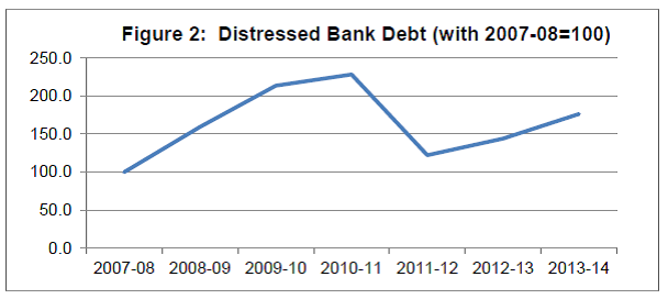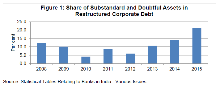 Press Release RBI Working Paper Series No. 10 Modelling Corporate Sector Distress in India @Manjusha Senapati and Saptarshi Ghosal Abstract 1The paper attempts to formulate a model to predict corporate financial distress of non-government non-financial public limited companies and estimate distressed bank debt due to the sample companies for the period 2006-07 to 2013-14. The model estimates probability of a company being financially distressed in the following year using the multivariate logistic regression based on three financial ratios viz., long term liabilities to total assets, operating profits to total liabilities, and current assets to current liabilities. The model was tested for some stressed industries/companies and was found to capture the underlying distress. Distressed bank debt for the sample companies was found to be increasing since 2011-12. Key Words: Corporate Financial Distress, Logit Analysis, Accounting Data, India JEL Classification: G33 Introduction Prediction of corporate financial distress or corporate failure is a central issue in any economy. Generally, prediction of corporate distress through mathematical or statistical models predicts whether a company will undergo financial distress based on the current financial data (Sun et al. 2014). Since the pioneering work in the area of failure classification done by Beaver (1966) and Altman (1968), many studies have been carried out to either to improve upon or to replicate. In the Indian context, such analysis is still evolving and is largely based on market variables. Moreover, in the absence of information on distressed companies, academic studies have used ratings data available from secondary sources to define distressed companies2. The motivation to undertake the study was mainly provided by the numerous reports on increasing indebtedness of Indian companies (and business groups at the aggregate level) pointing towards increasing corporate leverage. The Financial Stability Report (RBI, 2014) also cited high and increasing leverage and low profitability of Indian corporate sector as a high risk area. Therefore, the objective of the study is to develop a model that is able to estimate the probability of a company of being financially distressed in the next year. Such model can quickly evaluate and can be used by the risk managers corporate risk profile and can be used by the risk managers. Banks can use such model to know about the financial health of companies and their credit worthiness. Another distinguishing feature of the current study is that it attempts to apply data driven definition of distress for the identification of such companies. Earlier studies have mostly used available ratings data based on the market variables. This study uses the panel regression methodology to estimate the distress probabilities of the corporate which has been applied very rarely in the empirical literature in the Indian context. Against this backdrop, Section II presents a brief literature review of the various studies done so far. In section III, the extent of exposure of banks’ credit to non-financial corporate sector is discussed, while section IV highlights the recognition of distress in India. In Section V, the definition of corporate distress considered in this paper is discussed. Section VI gives an overview about the data, variables and methodology considered in the estimation of logistic model. Empirical findings of the paper are discussed in Section VII followed by conclusions in Section VIII. II. Review of Literature Beaver (1966) studied the corporate distress initially and provided the prediction models based on ratios. Beaver proposed two types of single variable analysis viz., profile analysis and univariate discriminant model. Through profile analysis for five years before failure, he found that the means of financial ratios in two groups were significantly different, and the gap was noticeable nearer to the failure. He built univariate discriminant models with the five ratios viz. cash flow to total debt, net income to total assets, total debt to total assets, working capital to total assets, and current ratio and found that the cash flow to total debt has the ability to correctly classify both failed and non-failed companies, even five years before failure. However, the ratio analysis has some limitations, e.g. all the ratios do not have the same discriminatory power. Moreover, ratios do not predict the failed and non-failed companies with same degree of success. Altman (1968) calculated bankruptcy probabilities using ratio analysis for the data on US manufacturing companies. The idea behind use of ratio analysis was that the failing company will exhibit very different ratio measurements than their counterparts. The ratios measuring profitability, liquidity and solvency were found to be most significant indicators. Using Multiple Discriminant Analysis (MDA), he converted the linear combinations of independent variables in scores (called Z scores) so that they could be classified into one of the two groups of bankrupt and non-bankrupt company. Z-scores were constructed from six basic accounting values (working capital, total assets, retained earnings, earnings before interest and taxes, book value of total liabilities, and sales) and one market based variable (market value of equity). The Z-score was found to accurately determine the bankruptcy in most of the cases. He found that the bankruptcy could be predicted up to two years prior to actual failure. MDA was widely used for distress prediction during 1970s and 1980s (Sharma and Mahajan (1980), Altman and Lavallee (1981); Ko (1982); and Izan (1984)). However, MDA assumes that independent variables should follow multivariate normal distribution and equal covariance matrix. Several other studies which pointed out these limitations include Eisenbeis (1977); Nam and Jinn (2000); Fathi and Jean (2001); Ugurlu and Aksoy (2006); and Wang and Deng (2006). Kare