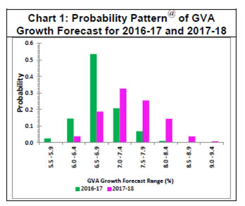 In terms of subjective probabilities, forecasters assigned the maximum chance of 54 per cent (based on the average of individual forecasts) to real GVA growth being in the range of 6.5-6.9 per cent in 2016-17 (Chart 1) and 33 per cent chance to GVA growth in the range of 7.0-7.4 per cent in 2017-18. | Table 1: Median Forecast of Real GVA (Growth Rate) for 2016-17 and 2017-18 | | | 2016-17 | 2017-18 | | Real GVA | 6.7 (-0.4) | 7.5 (+0.1) | | Agriculture and Allied Activities | 3.5 (+0.4) | 3.3 (+0.4) | | Industry | 5.8 (-1.1) | 7.2 (-0.1) | | Services | 8.0 (-0.4) | 8.8 (-0.2) | Note: 3. Growth rates are in per cent. 4 Figures in parentheses represents the extent of revisions relative to the 43rd round. | -