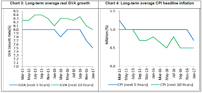 The long- term real GVA growth expectations is at 8.0 per cent, slightly lower than 8.1 per cent in the previous round. The medium-term growth forecast for the next five years remains at 7.5 per cent, which is 20 bps lower than in the last round (Chart 3). -