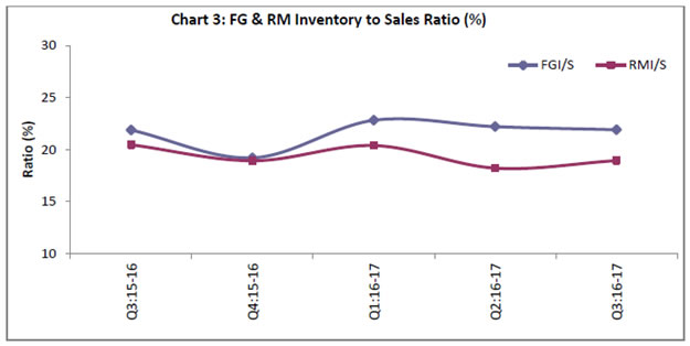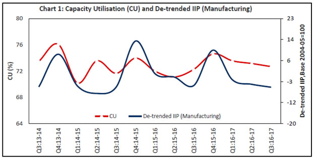 The 36th round of the Order Books, Inventories and Capacity Utilisation Survey (OBICUS) was conducted by the Reserve Bank of India for the quarter October-December, 2016 with responses from 710 companies1 providing a snapshot of demand conditions facing the Indian manufacturing sector. Highlights: 1) Capacity Utilisation (CU): At the aggregate level, CU declined successively for three quarters during 2016-17 and stood at 72.7 per cent in Q3:2016-17, co-moving with the de-trended index of industrial production2 (IIP) for manufacturing sector (Chart 1). 2) Order Books: New orders received during Q3:2016-17 recorded positive growth sequentially (quarter-on-quarter), although on a year-on-year basis, they declined for the third successive quarter (Chart 2). 3) Inventory to Sales Ratio: The finished goods inventory to sales ratio (FGI/S) remained almost at the same level as in the previous quarter, while the raw materials inventory to sales ratio (RMI/S) ticked up marginally in Q3:2016-17 (Chart 3). 4) Overall, movements in capacity utilisation, order books and inventories indicate that demand conditions in the manufacturing sector continued to remain subdued in Q3:2016-17. ANNEX Table 1: IIP-Manufacturing and Capacity Utilisation (CU) – (Based on common set of 661 companies in 5 quarters) | | Quarter | IIP-Mfg. (Quarterly Average Base 2004-05) | De-trended Quarterly IIP-Manufacturing | CU (in latest survey round) | CU * (Ranges from previous four survey rounds) | | Q3:2015-16 | 184.3 | -4.6 | 72.2 | 71.9 – 72.6 | | Q4:2015-16 | 198.9 | 9.7 | 74.6 | 74.0 – 74.1 | | Q1:2016-17 | 187.3 | -2.3 | 73.6 | 72.7 – 72.9 | | Q2:2016-17 | 185.7 | -4.1 | 73.1 | 72.4 | | Q3:2016-17 | 184.8 | -5.3 | 72.7 | NA # | *: Since CU is computed based on common set of companies for five quarters, it gets revised in the subsequent four rounds. #: CU is calculated first time for Q3:2016-17. | Table 2: Order Books (Q3:2015-16 to Q3:2016-17) – (Based on common set of 169 companies in 9 quarters)* | | Quarter | Amount (₹ Billion) | Q-o-Q Growth (%)** | Y-o-Y Growth (%) | | Average Backlog Orders | Average New Order Book | Average Pending Orders | Average Backlog Orders | Average New Order Book | Average Pending Orders | Average Backlog Orders | Average New Order Book | Average Pending Orders | | Q3:2015-16 | 1.108 | 0.915 | 1.106 | 7.9 | -1.3 | -0.2 | 4.9 | 5.6 | 7.7 | | Q4:2015-16 | 1.096 | 0.951 | 0.981 | -1.1 | 3.9 | -11.3 | 7.0 | 0.0 | -0.4 | | Q1:2016-17 | 0.980 | 0.916 | 0.951 | -10.6 | -3.7 | -3.1 | -0.7 | -2.3 | -7.3 | | Q2:2016-17 | 0.951 | 0.887 | 0.947 | -2.9 | -3.1 | -0.5 | -7.4 | -4.3 | -14.5 | | Q3:2016-17 | 0.943 | 0.904 | 0.982 | -0.8 | 1.9 | 3.7 | -14.9 | -1.3 | -11.2 | *: As required for calculating growth rates in recent 5 quarters. **: Not seasonally adjusted | Table 3: Average Sales and Inventories (Q3:2015-16 to Q3:2016-17) – (Based on common set of 485 companies in 5 quarters) | | Quarter | Amount (₹ Billion) | Ratio (per cent) | | Average Sales | Average Total Inv | Average FG Inv | Average WiP Inv | Average RM Inv | Total Inv/Sales | FG Inv/Sales | RM Inv/Sales | | Q3:2015-16 | 6.703 | 3.177 | 1.467 | 0.339 | 1.372 | 47.4 | 21.9 | 20.5 | | Q4:2015-16 | 7.010 | 2.955 | 1.346 | 0.282 | 1.327 | 42.2 | 19.2 | 18.9 | | Q1:2016-17 | 6.757 | 3.265 | 1.542 | 0.346 | 1.378 | 48.3 | 22.8 | 20.4 | | Q2:2016-17 | 7.150 | 3.368 | 1.588 | 0.478 | 1.302 | 47.1 | 22.2 | 18.2 | | Q3:2016-17 | 7.480 | 3.469 | 1.639 | 0.414 | 1.417 | 46.4 | 21.9 | 18.9 | | RM - Raw Material; WiP - Work in progress; FG - Finished Goods; Inv – Inventory. | |
