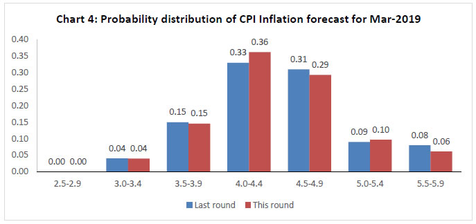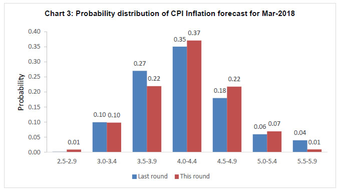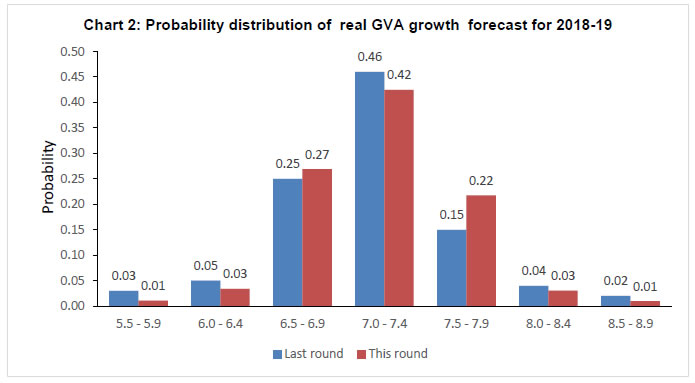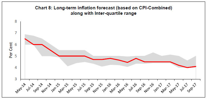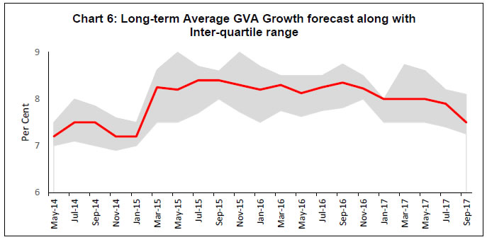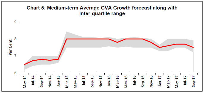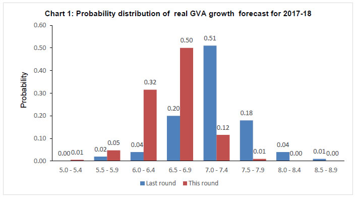 Professional forecasters have moderated their growth expectation for 2017-18 and 2018-19 in view of tempered assessment of private consumption demand and industrial growth. Nevertheless, they expect growth consolidation with higher saving and investment rate in 2018-19. Headline consumer price inflation is expected to increase to 5.0 per cent in Q1: 2018-19. On the external front, they anticipate improvement in foreign trade in the current year as well as in the next year. The Reserve Bank has been conducting the Survey of Professional Forecasters (SPF) since September 2007. Thirty panelists participated in the 48th round of the survey conducted during September 20172. The survey results are summarised in terms of their median forecasts and consolidated in Annexes 1-8, along with quarterly paths for key variables. Highlights: 1. Output • Real gross domestic product (GDP) and real gross value added (GVA) are likely to grow by 6.8 and 6.6 per cent, respectively, in 2017-18 and at 7.4 per cent each in 2018-19 (Table 1). • Expectations of both saving and investment rates in 2017-18 have moderated, but the both are anticipated to improve in the next year. | Table 1: Median Forecast of Growth in Real GDP, GVA and Components | | (in per cent) | | | 2017-18 | 2018-19 | | Real GDP Growth | 6.8 (-0.6) | 7.4 (-0.4) | | Real GVA Growth | 6.6 (-0.6) | 7.4 (-0.2) | | a. Agriculture and Allied Activities | 3.2 (-0.3) | 3.0 (0.0) | | b. Industry | 4.8 (-2.4) | 7.0 (-0.6) | | c. Services | 8.1 (-0.2) | 8.7 (-0.1) | Private Final Consumption Expenditure (nominal) (growth rate in per cent) | 11.0 (-1.5) | 12.7 (+0.1) | Gross Saving Rate [per cent of gross national deposable income (GNDI)] | 31.2 (-0.8) | 32.3 (0.0) | Gross Fixed Capital Formation Rate (per cent of GDP) | 26.5 (-1.5) | 27.6 (-1.4) | | Note: In all the tables, the figures in parentheses indicate the extent of revision in median forecasts (percentage points) relative to the previous SPF round. | • The summary probability distribution of forecasts has shifted marginally lower when compared with the previous survey round; forecasters have assigned maximum probability to GVA growth being in the range 6.5-6.9 per cent (Chart 1). • For 2018-19, forecasters assigned maximum probability to GVA growth in the range 7.0-7.4 per cent, with a flatter probability distribution than in the previous round (Chart 2). 2. Inflation • Headline consumer price index (CPI) inflation is expected to gradually increase from current levels to 5.0 per cent in Q1:2018-19 (Table 2). • Core inflation (i.e., CPI excluding food and beverages, pan, tobacco and intoxicants, and fuel and light), which is currently higher than headline inflation, is also expected to be increase by 60 basis points to 4.9 per cent in Q2:2018-19. | Table 2: Median Forecast of Quarterly Inflation | | (in per cent) | | | Q2:17-18 | Q3:17-18 | Q4:17-18 | Q1:18-19 | Q2:18-19 | | CPI - Headline | 3.1 (+0.6) | 4.1 (+0.4) | 4.5 (+0.2) | 5.0 (+0.4) | 4.5 | | CPI excluding food & beverages, pan, tobacco & intoxicants and fuel & light | 4.3 (+0.2) | 4.6 (+0.1) | 4.8 (0.0) | 4.9 (+0.3) | 4.9 | | WPI – All Commodities | 2.8 (+0.7) | 3.2 (+1.0) | 2.8 (+0.6) | 3.4 (+0.9) | 3.3 | | WPI - Non-food Manufactured Products | 2.5 (0.0) | 2.5 (+0.1) | 2.5 (+0.4) | 2.7 (+0.5) | 2.8 | • Forecasters assigned highest probability to CPI inflation being in the range 4.0-4.4 per cent in March 2018 and the summarised probability distribution has marginally tilted up when compared with the previous survey round (Chart 3). • For March 2019, forecasters assigned the highest probability to CPI inflation being in the range 4.0-4.4 per cent (Chart 4). 3. External Sector • There is greater optimism around the growth of both exports and imports (in US dollar terms), shedding the sluggishness of recent years (Table 3). • Forecasters expect higher import growth in 2017-18 and 2018-19 and consequently, a wider current account deficit (CAD) in these years. | Table 3: Median Forecast of Select External Sector Variables | | | 2017-18 | 2018-19 | Merchandise Exports – in US $ terms (annual growth in per cent) | 6.5 (-1.0) | 7.9 (+0.3) | Merchandise Imports– in US $ terms (annual growth in per cent) | 11.5 (+2.5) | 9.5 (+1.5) | Current Account Deficit (Ratio to GDP at current market price, in per cent) | 1.5 (+0.3) | 1.8 (+0.4) | 4. Medium-term and Long-term Forecasts • Real GVA growth is expected to be around 7.5 per cent both in the medium-term (five-year average) and in the long-term (ten-year average), a moderation of 20 basis points (bps) and 40 bps, respectively, from the previous survey round (Charts 5 and 6). • CPI-headline inflation is expected to be around 4.3 and 4.1 per cent in the medium-term and the long-term, respectively (Chart 7 and 8). The Reserve Bank thanks the following institutions for their participation in this round of the Survey of Professional Forecasters (SPF): Debopam Chaudhuri, Piramal Enterprises Limited; ICICI Securities Primary Dealership; Madan Sabnavis, CARE RATINGS; Upasna Bhardwaj, Kotak Mahindra Bank; Sameer Narang, Indranil Pan, IDFC Bank; Shailesh Kejariwal, B&K Securities India Pvt Ltd; Deepali Bhargava, Credit Suisse; CRISIL Limited; Gaurav Kapur, IndusInd Bank Ltd.; and Nikhil Gupta, Motilal Oswal. The Bank also acknowledges the contribution of 20 others SPF panelists, who preferred to remain anonymous, to the survey. | | Annex 1: Annual Forecasts for 2017-18 | | | Key Macroeconomic Indicators | Annual Forecasts for 2017-18 | | Mean | Median | Max | Min | 1st quartile | 3rd quartile | | 1 | GDP at constant (2011-12) prices: Annual Growth (per cent) | 6.8 | 6.8 | 7.2 | 6.2 | 6.6 | 7.0 | | 2 | GVA at basic prices at constant (2011-12) prices: Annual Growth rate (per cent) | 6.6 | 6.6 | 7.1 | 6.0 | 6.5 | 6.8 | | a | Agriculture & Allied Activities (growth rate in per cent) | 3.2 | 3.2 | 4.1 | 2.1 | 3.0 | 3.6 | | b | Industry (growth rate in per cent) | 4.8 | 4.8 | 6.3 | 3.4 