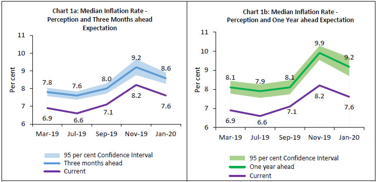 Today, the Reserve Bank released the results of the January 2020 round of the Inflation Expectations Survey of Households (IESH). The survey was conducted in 18 major cities and the results are based on responses from 5,868 urban households. Highlights: i. After a sharp pick up in November 2019, households’ inflation perceptions and expectations moderated in January 2020, though they remained higher than the earlier part of the year. Median inflation expectations over three months and one year horizons eased by 60 basis points and 70 basis points, respectively (Chart 1a, Chart 1b & Table 2). ii. Most households expect that prices will continue to rise. However, the proportion of households expecting increase in food prices has declined, albeit marginally (Table 1a & Table 1b). Note: Please see the excel file for time series data. | Table 1(a): Product-wise Expectations of Prices for Three Months ahead | | (Percentage of Respondents) | | Survey period ended | Dec-18 | Jul-19 | Sep-19 | Nov-19 | Jan-20 | | General | Estimate | SE | Estimate | SE | Estimate | SE | Estimate | SE | Estimate | SE | | Prices will increase | 72.9 | 1.04 | 77.9 | 0.95 | 79.3 | 0.94 | 80.7 | 0.90 | 83.2 | 0.87 | | Price increase more than current rate | 46.2 | 1.14 | 49.8 | 1.15 | 49.0 | 1.23 | 52.4 | 1.22 | 56.1 | 1.16 | | Price increase similar to current rate | 23.3 | 0.96 | 24.7 | 0.98 | 25.1 | 1.04 | 23.4 | 0.96 | 23.4 | 0.91 | | Price increase less than current rate | 3.4 | 0.39 | 3.4 | 0.38 | 5.2 | 0.51 | 4.9 | 0.55 | 3.6 | 0.37 | | No changes in prices | 21.2 | 0.98 | 18.5 | 0.88 | 18.6 | 0.92 | 17.3 | 0.84 | 14.4 | 0.81 | | Decline in prices | 5.8 | 0.46 | 3.6 | 0.39 | 2.1 | 0.29 | 1.9 | 0.26 | 2.4 | 0.31 | | Food Product | | | | | | | | | | | | Prices will increase | 70.7 | 0.98 | 80.0 | 0.87 | 81.4 | 0.86 | 81.8 | 0.80 | 81.7 | 0.80 | | Price increase more than current rate | 42.7 | 1.08 | 48.5 | 1.09 | 52.9 | 1.14 | 54.8 | 1.14 | 56.0 | 1.11 | | Price increase similar to current rate | 22.4 | 0.87 | 25.7 | 1.01 | 21.4 | 0.88 | 21.0 | 0.85 | 20.1 | 0.85 | | Price increase less than current rate | 5.7 | 0.48 | 5.8 | 0.47 | 7.1 | 0.59 | 6.0 | 0.54 | 5.5 | 0.45 | | No changes in prices | 17.2 | 0.79 | 13.8 | 0.75 | 13.2 | 0.78 | 12.3 | 0.65 | 11.2 | 0.67 | | Decline in prices | 12.0 | 0.65 | 6.2 | 0.52 | 5.4 | 0.45 | 5.9 | 0.48 | 7.2 | 0.50 | | Non- Food Product | | | | | | | | | | | | Prices will increase | 67.6 | 1.00 | 73.8 | 0.97 | 74.7 | 0.95 | 75.3 | 0.93 | 77.8 | 0.91 | | Price increase more than current rate | 40.8 | 1.08 | 43.1 | 1.14 | 45.5 | 1.16 | 48.0 | 1.14 | 51.4 | 1.15 | | Price increase similar to current rate | 21.6 | 0.89 | 25.2 | 0.93 | 21.8 | 0.90 | 21.1 | 0.86 | 21.2 | 0.88 | | Price increase less than current rate | 5.3 | 0.47 | 5.5 | 0.46 | 7.3 | 0.57 | 6.1 | 0.53 | 5.3 | 0.43 | | No changes in prices | 20.5 | 0.85 | 20.4 | 0.90 | 20.8 | 0.88 | 20.5 | 0.83 | 17.7 | 0.82 | | Decline in prices | 11.9 | 0.63 | 5.8 | 0.48 | 4.5 | 0.42 | 4.3 | 0.39 | 4.4 | 0.39 | | Household Durables | | | | | | | | | | | | Prices will increase | 56.8 | 1.08 | 57.9 | 1.07 | 56.2 | 1.07 | 55.2 | 1.09 | 60.3 | 1.02 | | Price increase more than current rate | 34.8 | 1.08 | 33.7 | 1.05 | 33.9 | 1.11 | 35.4 | 1.06 | 37.9 | 1.03 | | Price increase similar to current rate | 17.9 | 0.85 | 19.6 | 0.81 | 17.3 | 0.80 | 15.2 | 0.73 | 17.5 | 0.76 | | Price increase less than current rate | 4.1 | 0.39 | 4.6 | 0.41 | 4.9 | 0.45 | 4.6 | 0.44 | 4.8 | 0.43 | | No changes in prices | 24.8 | 0.91 | 28.2 | 0.96 | 28.5 | 0.96 | 29.1 | 0.93 | 26.8 | 0.91 | | Decline in prices | 18.4 | 0.77 | 13.9 | 0.67 | 15.4 | 0.73 | 15.8 | 0.73 | 12.9 | 0.65 | | Cost of Housing | | | | | | | | | | | | Prices will increase | 69.1 | 1.03 | 68.6 | 1.01 | 68.1 | 1.10 | 68.5 | 1.09 | 69.7 | 1.04 | | Price increase more than current rate | 46.5 | 1.06 | 45.2 | 1.04 | 45.2 | 1.23 | 48.3 | 1.19 | 48.4 | 1.10 | | Price increase similar to current rate | 18.2 | 0.79 | 19.4 | 0.82 | 17.9 | 0.81 | 16.4 | 0.77 | 17.3 | 0.74 | | Price increase less than current rate | 4.5 | 0.41 | 4.0 | 0.38 | 5.0 | 0.44 | 3.8 | 0.41 | 4.0 | 0.40 | | No changes in prices | 22.2 | 0.94 | 22.8 | 0.90 | 23.1 | 0.98 | 24.0 | 0.99 | 22.0 | 0.95 | | Decline in prices | 8.6 | 0.57 | 8.6 | 0.58 | 8.7 | 0.59 | 7.4 | 0.53 | 8.3 | 0.54 | | Cost of Services | | | | | | | | | | | | Prices will increase | 65.7 | 1.10 | 66.1 | 1.03 | 63.5 | 1.04 | 65.8 | 1.05 | 72.5 | 0.98 | | Price increase more than current rate | 40.2 | 1.11 | 39.8 | 1.07 | 40.2 | 1.15 | 43.6 | 1.14 | 46.4 | 1.13 | | Price increase similar to current rate | 21.2 | 0.82 | 21.6 | 0.83 | 18.1 | 0.76 | 17.7 | 0.79 | 21.1 | 0.81 | | Price increase less than current rate | 4.3 | 0.41 | 4.7 | 0.42 | 5.3 | 0.45 | 4.5 | 0.46 | 4.9 | 0.43 | | No changes in prices | 28.2 | 1.02 | 28.7 | 0.94 | 31.6 | 1.00 | 29.5 | 1.01 | 23.4 | 0.90 | | Decline in prices | 6.1 | 0.45 | 5.3 | 0.46 | 4.8 | 0.42 | 4.7 | 0.43 | 4.1 | 0.38 | Note: 1. The table provides estimates and standard errors for qualitative responses. 2. Constituent items may not add up to the corresponding total, due to rounding off. | | Table 1(b): Product-wise Expectations of Prices for One Year ahead | | (Percentage of Respondents) | | Survey period ended | Dec-18 | Jul-19 | Sep-19 | Nov-19 | Jan-20 | | General | Estimate | SE | Estimate | SE | Estimate | SE | Estimate | SE | Estimate | SE | | Prices will increase | 83.8 | 0.82 | 83.8 | 0.87 | 87.0 | 0.78 | 89.1 | 0.71 | 88.1 | 0.74 | | Price increase more than current rate | 57.5 | 1.15 | 56.8 | 1.15 | 57.3 | 1.29 | 64.0 | 1.25 | 63.6 | 1.13 | | Price increase similar to current rate | 23.3 | 1.00 | 24.1 | 1.01 | 25.1 | 1.07 | 21.5 | 0.96 | 21.4 | 0.88 | | Price increase less than current rate | 3.0 | 0.37 | 2.9 | 0.35 | 4.6 | 0.47 | 3.6 | 0.44 | 3.2 | 0.37 | | No changes in prices | 11.3 | 0.73 | 12.6 | 0.78 | 10.6 | 0.73 | 8.9 | 0.64 | 9.5 | 0.67 | | Decline in prices | 4.9 | 0.43 | 3.6 | 0.40 | 2.4 | 0.31 | 2.0 | 0