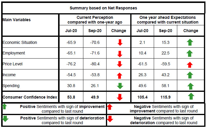 Today, the Reserve Bank released the results of the September 2020 round of its Consumer Confidence Survey (CCS)1. In view of the Covid-19 pandemic, the survey was conducted through telephonic interviews during August 29 – September 10, 2020 in thirteen major cities, viz., Ahmedabad; Bengaluru; Bhopal; Chennai; Delhi; Guwahati; Hyderabad; Jaipur; Kolkata; Lucknow; Mumbai; Patna; and Thiruvananthapuram. Perceptions and expectations on general economic situation, employment scenario, overall price situation and own income and spending have been obtained from 5,364 households across these cities2. Highlights: I. The current situation index (CSI)3 recorded its third successive all-time low, as the respondents perceived further worsening in general economic situation and employment scenario during the last one year (Chart 1, Tables 1 and 2). II. Households were, however, more confident for the year ahead: the future expectations index (FEI) improved for the second successive survey round. Note: Please see the excel file for time series data III. More respondents reported curtailment in both overall and essential spending during the past one year, when compared with the last survey round (Table 6, 7 and 8). IV. Consumers expect improvements in general economic situation, employment conditions and income scenario during the coming year; discretionary spending, however, is expected to remain low in the near future (Tables 1, 2, 5 and 8). | Table 1: Perceptions and Expectations on the General Economic Situation | | (Percentage responses) | | Survey Round | Current Perception | One year ahead Expectation | | Improved | Remained Same | Worsened | Net Response | Will Improve | Will Remain Same | Will Worsen | Net Response | | Sep-19 | 33.5 | 18.6 | 47.9 | -14.4 | 53.2 | 15.0 | 31.8 | 21.4 | | Nov-19 | 30.0 | 18.4 | 51.6 | -21.6 | 48.9 | 16.5 | 34.7 | 14.2 | | Jan-20 | 27.1 | 18.0 | 54.9 | -27.8 | 48.8 | 14.3 | 36.9 | 11.9 | | Mar-20 | 28.4 | 19.3 | 52.3 | -23.9 | 49.8 | 15.6 | 34.7 | 15.1 | | May-20 | 14.4 | 11.2 | 74.4 | -60.0 | 39.6 | 9.0 | 51.4 | -11.7 | | Jul-20 | 11.9 | 10.3 | 77.8 | -65.9 | 44.3 | 13.5 | 42.2 | 2.1 | | Sep-20 | 9.0 | 11.4 | 79.6 | -70.6 | 50.1 | 15.1 | 34.8 | 15.3 | | Table 2: Perceptions and Expectations on Employment | | (Percentage responses) | | Survey Round | Current Perception | One year ahead Expectation | | Improved | Remained Same | Worsened | Net Response | Will Improve | Will Remain Same | Will Worsen | Net Response | | Sep-19 | 28.0 | 19.5 | 52.5 | -24.5 | 51.2 | 15.4 | 33.4 | 17.8 | | Nov-19 | 24.4 | 18.1 | 57.5 | -33.1 | 46.3 | 17.7 | 36.0 | 10.3 | | Jan-20 | 24.6 | 17.8 | 57.7 | -33.1 | 48.4 | 16.3 | 35.4 | 13.0 | | Mar-20 | 25.2 | 19.1 | 55.7 | -30.5 | 48.8 | 17.1 | 34.1 | 14.7 | | May-20 | 19.2 | 13.4 | 67.4 | -48.2 | 41.5 | 11.1 | 47.4 | -5.9 | | Jul-20 | 13.0 | 8.9 | 78.1 | -65.1 | 48.6 | 13.3 | 38.2 | 10.4 | | Sep-20 | 10.1 | 8.1 | 81.7 | -71.6 | 54.1 | 14.3 | 31.6 | 22.5 | | Table 3: Perceptions and Expectations on Price Level | | (Percentage responses) | | Survey Round | Current Perception | One year ahead Expectation | | Increased | Remained Same | Decreased | Net Response | Will Increase | Will Remain Same | Will Decrease | Net Response | | Sep-19 | 86.1 | 10.6 | 3.3 | -82.8 | 75.9 | 13.8 | 10.3 | -65.6 | | Nov-19 | 86.8 | 10.2 | 2.9 | -83.9 | 78.0 | 14.1 | 7.9 | -70.1 | | Jan-20 | 90.6 | 7.6 | 1.9 | -88.7 | 76.9 | 12.9 | 10.2 | -66.7 | | Mar-20 | 87.2 | 10.3 | 2.6 | -84.6 | 78.1 | 14.2 | 7.7 | -70.4 | | May-20 | 79.1 | 17.5 | 3.4 | -75.8 | 75.8 | 14.8 | 9.4 | -66.4 | | Jul-20 | 79.7 | 16.7 | 3.6 | -76.2 | 71.6 | 18.3 | 10.1 | -61.5 | | Sep-20 | 82.9 | 14.6 | 2.5 | -80.4 | 69.5 | 20.5 | 10.0 | -59.5 | | Table 4: Perceptions and Expectations on Rate of Change in Price Level (Inflation)* | | (Percentage responses) | | Survey Round | Current Perception | One year ahead Expectation | | Increased | Remained Same | Decreased | Net Response | Will Increase | Will Remain Same | Will Decrease | Net Response | | Sep-19 | 74.2 | 19.5 | 6.3 | -67.9 | 77.9 | 16.1 | 6.1 | -71.8 | | Nov-19 | 77.2 | 17.4 | 5.5 | -71.7 | 77.3 | 17.3 | 5.4 | -71.9 | | Jan-20 | 84.9 | 11.2 | 4.0 | -80.9 | 80.3 | 14.7 | 5.0 | -75.3 | | Mar-20 | 80.8 | 15.7 | 3.5 | -77.3 | 75.6 | 20.3 | 4.1 | -71.5 | | May-20 | 74.8 | 18.6 | 6.6 | -68.2 | 73.4 | 19.5 | 7.1 | -66.3 | | Jul-20 | 79.8 | 15.6 | 4.5 | -75.3 | 76.4 | 18.6 | 5.0 | -71.4 | | Sep-20 | 83.0 | 13.1 | 3.9 | -79.1 | 75.9 | 19.6 | 4.6 | -71.3 | | *Applicable only for those respondents who felt price has increased/price will increase. | | Table 5: Perceptions and Expectations on Income | | (Percentage responses) | | Survey Round | Current Perception | One year ahead Expectation | | Increased | Remained Same | Decreased | Net Response | Will Increase | Will Remain Same | Will Decrease | Net Response | | Sep-19 | 25.0 | 48.3 | 26.7 | -1.7 | 53.0 | 37.4 | 9.6 | 43.4 | | Nov-19 | 24.1 | 49.2 | 26.7 | -2.6 | 52.8 | 38.9 | 8.3 | 44.5 | | Jan-20 | 21.9 | 51.2 | 26.9 | -5.0 | 51.9 | 38.9 | 9.2 | 42.7 | | Mar-20 | 22.7 | 52.4 | 24.9 | -2.2 | 52.0 | 40.2 | 7.8 | 44.2 | | May-20 | 12.6 | 34.0 | 53.4 | -40.8 | 39.5 | 39.1 | 21.4 | 18.1 | | Jul-20 | 8.3 | 28.9 | 62.8 | -54.5 | 43.5 | 39.3 | 17.2 | 26.3 | | Sep-20 | 8.9 | 28.4 | 62.7 | -53.8 | 53.2 | 36.7 | 10.0 | 43.2 | | Table 6: Perceptions and Expectations on Spending | | (Percentage responses) | | Survey Round | Current Perception | One year ahead Expectation | | Increased | Remained Same | Decreased | Net Response | Will Increase | Will Remain Same | Will Decrease | Net Response | | Sep-19 | 74.1 | 22.0 | 3.8 | 70.3 | 77.0 | 19.0 | 4.0 | 73.0 | | Nov-19 | 73.2 | 23.4 | 3.4 | 69.8 | 77.4 | 19.0 | 3.6 | 73.8 | | Jan-20 | 76.3 | 20.5 | 3.2 | 73.1 | 78.7 | 17.3 | 4.0 | 74.7 | | Mar-20 | 72.6 | 24.0 | 3.4 | 69.2 | 75.8 | 20.7 | 3.5 | 72.3 | | May-20 | 56.1 | 31.0 | 12.9 | 43.2 | 64.3 | 27.0 | 8.7 | 55.6 | | Jul-20 | 48.1 | 34.7 | 17.2 | 30.8 | 60.2 | 29.2 | 10.6 | 49.6 | | Sep-20 | 47.2 | 31.8 | 21.