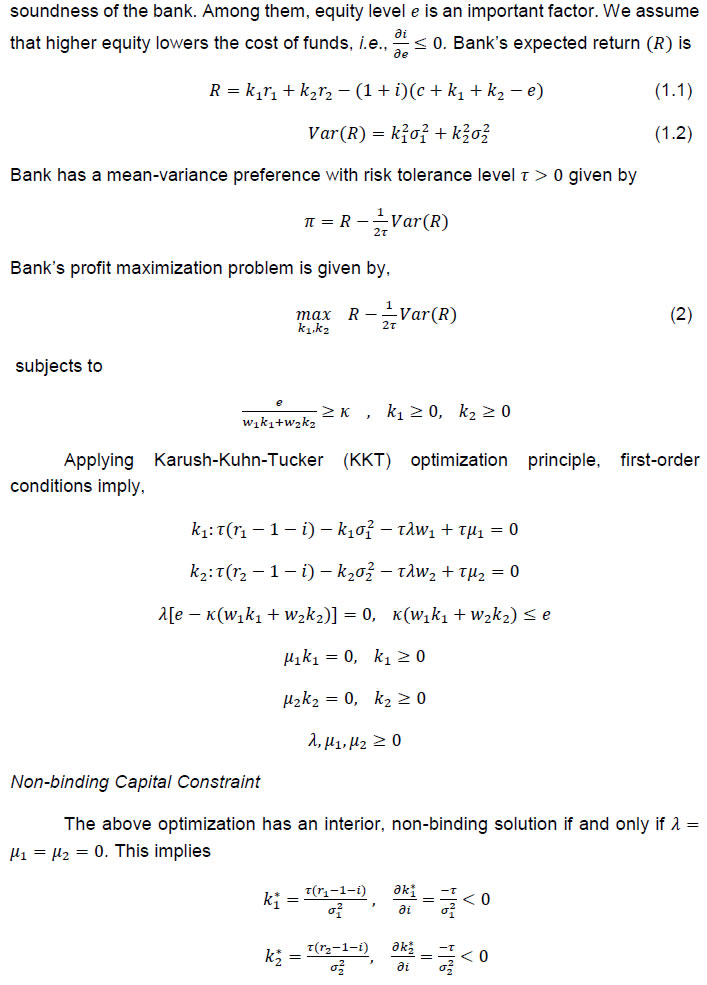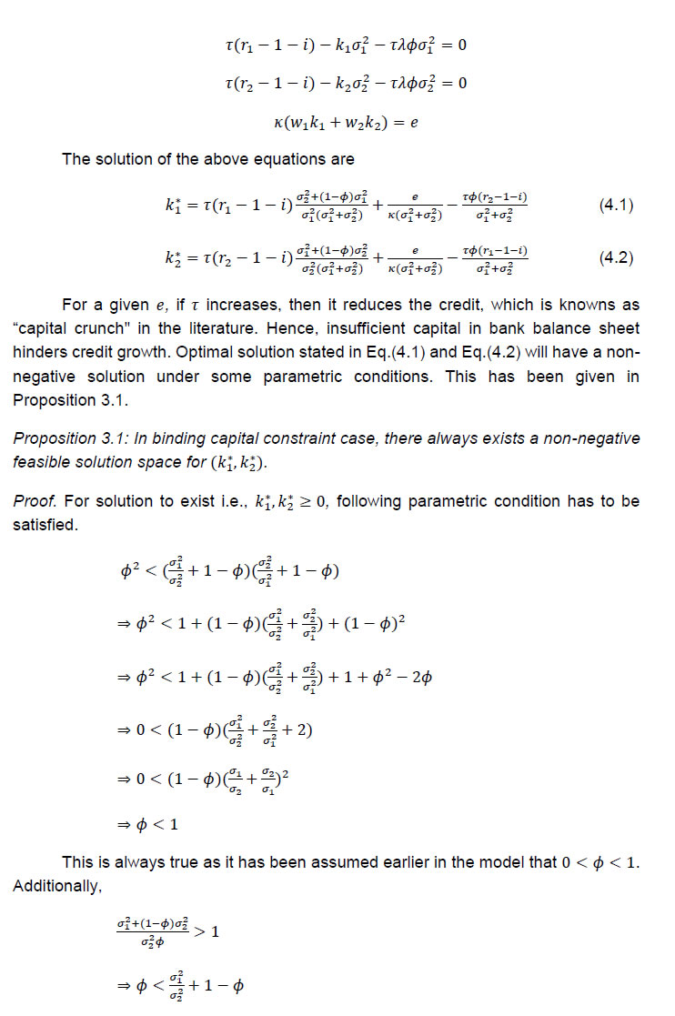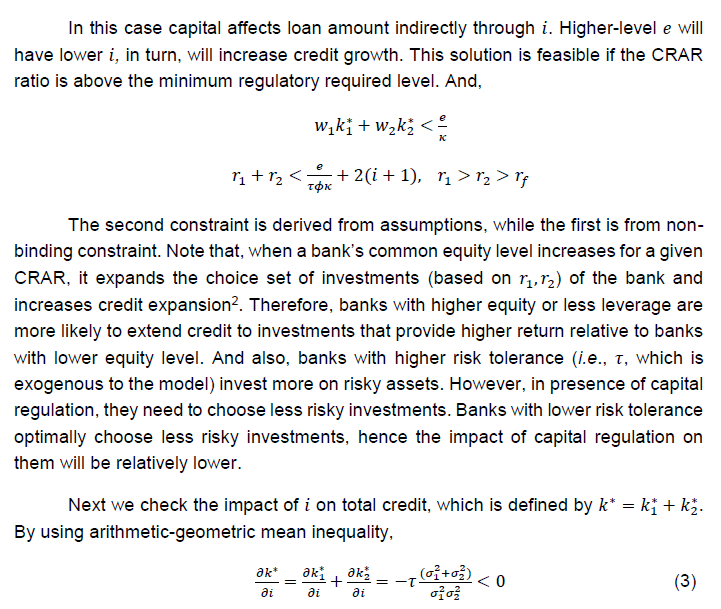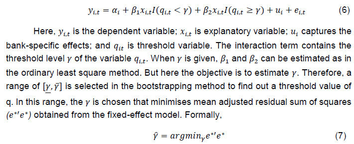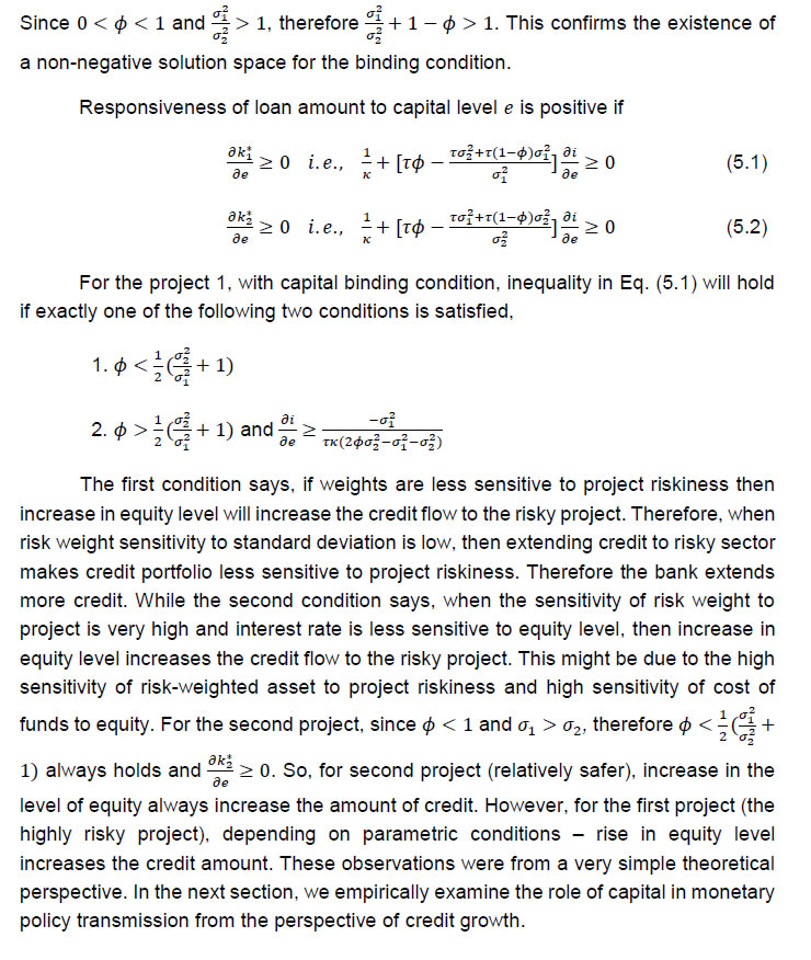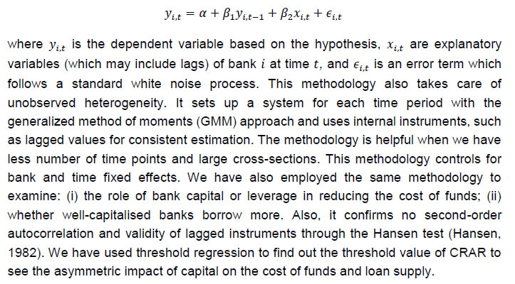 | Table 5: Bank capital and loan supply | | Dependent Variable | Overall Sample | Public Sector Banks | | Loan Growth Rate i,t | Loan Growth Rate i,t | Loan Growth Rate i,t | Loan Growth Rate i,t | | Loan Growth Ratei,t-1 | 0.0778*** | 0.282*** | 0.156** | 0.271*** | | | (0.0195) | (0.0251) | (0.0751) | (0.0677) | | CRAR i,t-1 | 0.0781*** | | 0.121*** | | | | (0.00726) | | (0.0367) | | | GNPA Ratio i,t-1 | -0.00861*** | -0.0134*** | -0.00554** | -0.0115*** | | | (0.000452) | (0.000755) | (0.00251) | (0.00122) | | MP × CRAR i,t-1 | -0.00577*** | | -0.0115** | | | | (0.000963) | | (0.00490) | | | MP ×CE/TA i,t-1 | | -0.00000775*** | | -0.00000507* | | | | (0.00000160) | | (0.00000300) | | Constant | -0.809*** | 0.286*** | -1.339*** | 0.296*** | | | (0.101) | (0.0130) | (0.485) | (0.0258) | | N | 240 | 240 | 168 | 168 | | AR(1) test p-value | 0.001 | 0.0001 | 0.0004 | 0.0008 | | AR(2) test p-value | 0.204 | 0.282 | 0.109 | 0.155 | | Hansen J-test p-value | 0.553 | 0.710 | 0.300 | 0.978 | | Note: The figures in parentheses are standard errors. * p < 0.1, ** p < 0.05, *** p < 0.01 | Results of the above models are reported in Table 5. A positive and statistically significant value of CRAR implies that an increase in CRAR leads to higher loan growth. This provides the evidence of unlocking of the bank lending channel. For each one percentage point increase in CRAR, there is 7.8 percentage points rise in loan growth rate. On the contrary, one percentage point increase in GNPA ratio reduces the loan growth rate by 0.9 percentage points. Therefore, it is always an optimal strategy for any bank to go for higher capital and lower GNPAs to experience better loan growth. As expected, tighter monetary policy negatively influences the loan growth rate. This effect is larger for banks with higher CRAR as captured through the interaction term (a product of MP with CRAR). However, a statistically significant and negative coefficient of GNPA ratio signifies the weakening of monetary policy transmission in the presence of large stressed assets. Hence, it can be concluded that higher CRAR helps in smooth transmission of monetary policy whereas massive GNPAs in banking sector adversely influences the channel. On the other hand, the effect of a monetary tightening is found to be larger for a highly leveraged bank as compared to less leveraged bank as observed from the interaction term MP*TA/CE. In line with the argument on the bank lending channel, higher CRAR helps in unlocking the credit channel3. On the other hand, the bank capital channel provides another justification as to why banks with lower capital can still transmit monetary policy shocks significantly. To examine the above arguments, we adopt the threshold regression approach in estimating the impact of monetary policy on the loan growth rate. As shown in Table 6, the threshold variable is CRAR for the first model (in columns 2 and 4) and total assets to common equity in the second model (in columns 3 and 5). For all banks, monetary policy is 1.5 times more effective if CRAR is below 12.17 per cent. The result is similar for public sectors banks, but the sensitivity is relatively higher as compared to the overall sample. The results are not qualitatively different when we consider the threshold variable TA/CE. However, the magnitude is lower when TA/CE is below the threshold level, i.e., the banks with a higher level of common equity relative to debt weakly transmit monetary policy. In sum, the results imply that banks are more sensitive to monetary policy shocks if their capital position is not much greater than their regulatory requirement level. After a threshold level, the effectiveness of monetary policy in influencing credit supply of banks declines as monetary policy may have only a negligible effect on their profits and thereby on their capital position. | Table 6: Threshold regression model results | | Dependent Variable | Overall Sample | Public Sector Banks | | Loan Growth Rate i,t | Loan Growth Rate i,t | Loan Growth Rate i,t | Loan Growth Rate i,t | | Loan Growth Rate i,t-1 | 0.173** | 0.197*** | 0.145 | 0.143 | | | (0.0711) | (0.0724) | (0.112) | (0.113) | | GNPA Ratio i,t-1 | -0.00827*** | -0.0100*** | -0.00947*** | -0.0112*** | | | (0.00177) | (0.00176) | (0.00250) | (0.00248) | | MP×I(CRAR≤γ) | -0.0260*** | | -0.0283*** | | | | (0.00499) | | (0.00588) | | | MP×I(CRAR>γ) | -0.0179*** | | -0.0201*** | | | | (0.00527) | | (0.00648) | | | MP ×I(TA≤γ) | | -0.0221*** | | -0.0206*** | | | | (0.00523) | | (0.00673) | | MP ×I(TA>γ) | | -0.0315*** | | -0.0318*** | | | | (0.00612) | | (0.00597) | | Constant | 0.273*** | 0.298*** | 0.292*** | 0.345*** | | | (0.0405) | (0.0407) | (0.0544) | (0.0536) | | N | 240 | 240 | 168 | 168 | | Threshold Effect Test | 0.002 | 0.60 | 0.02 | 0.26 | | Threshold Value | 12.17 | 778.50 | 12.17 | 97.56 | | R2 | 0.48 | 0.40 | 0.54 | 0.50 | | Note: The figures in parentheses are standard errors. * p < 0.1, ** p < 0.05, *** p < 0.01 | VI. Conclusions The study finds evidence on the existence of the bank capital channel of monetary policy transmission for India. There is a positive association between bank equity and credit growth. This finding calls for the need for countercyclical capital buffer for the Indian banks to protect their balance sheet against losses from changes in economic conditions during the recessionary phase. Also, banks with higher CRAR face a lower cost of funds. The pro-cyclical nature of leverage shows that banks lend during economic boom by raising debt funds (through deposits, borrowings) rather than using their excess capital. Higher CRAR unlocks the bank lending channel and helps in smooth transmission of monetary policy. However, the magnitude of transmission of monetary policy was found to be weak for banks with CRAR higher than a certain threshold level. Presence of non-performing assets in a bank also weakens monetary policy transmission and lowers the loan growth rate. T