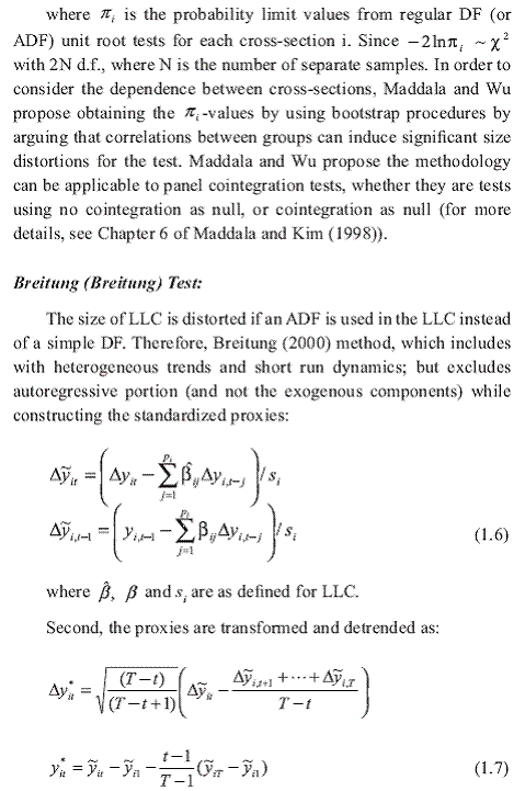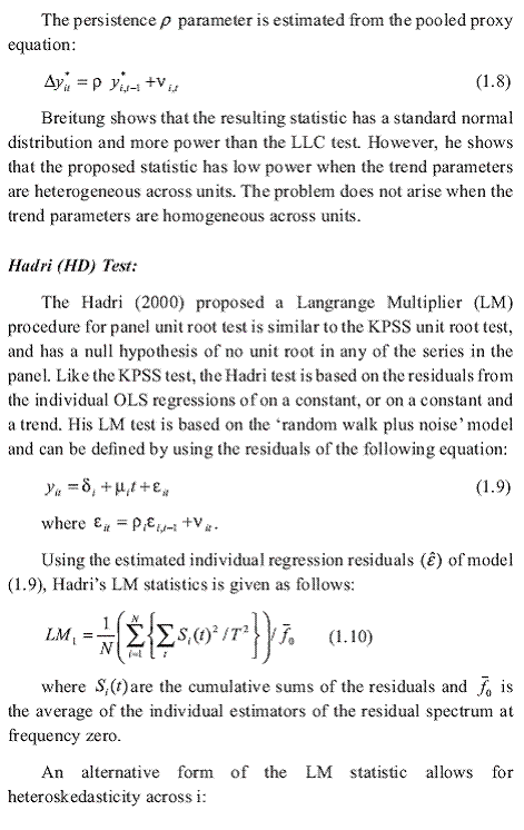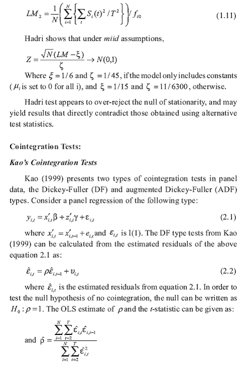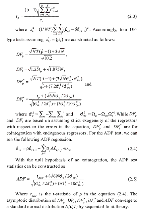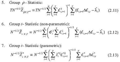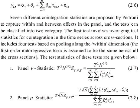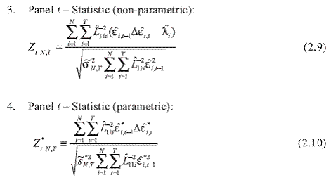 The second category includes three tests based on pooling the ‘between’ dimension (averaging the AR coefficients for each member of the panel for unit root test on residuals) and the parameter is allowed to vary over the cross sections. In these tests, therefore, the averaging is done in pieces so that the limiting distributions are based on limits of piecewise numerator and denominator terms. These test statistics can be given as: