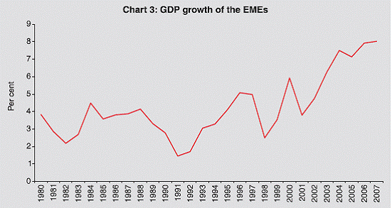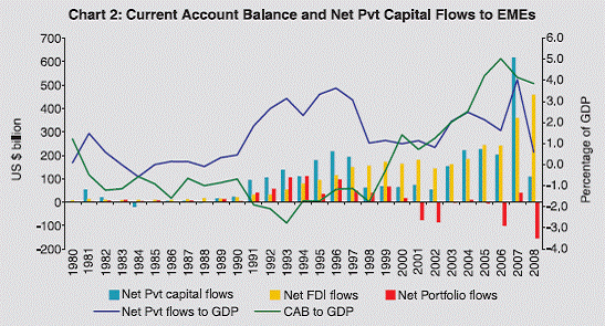 Another notable feature of emerging market economies is that the current account balance became positive since 2000 as against net deficits during the 1980s and 1990s (Figure 2). Furthermore, net private capital flows remained buoyant during mid-1990s and 2000s maintaining a high growth momentum. The net inflow came down significantly in 2008, especially in the later half of the year, reflecting risk aversion of the investors due to global crisis that started with the US sub-prime debacle in August 2007.
