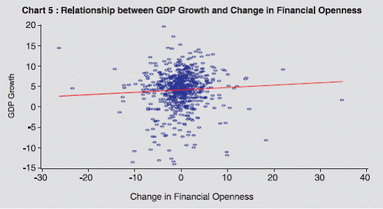 The same can be confirmed from the positive current account balance reflecting net exporter of capital. Therefore, the immediate question is whether the EMEs need capital inflows at all and if they require, how effective is capital flows for them in achieving their goals. As mentioned above, it may be possible that higher growth in the EMEs attracting capital flows. However, as can be observed from a scattered regression plot for select 27 emerging countries given in Figure 5 that there is a positive relationship between per capita GDP growth and financial openness6. It may be possible that productivity growth led by financial globalization has been impacting GDP growth. Thus, it is relevant to study the relationship between capital flows and economic growth in EMEs. To examine this issue we tried to study the long-run linkages of financial openness and per capita GDP.
