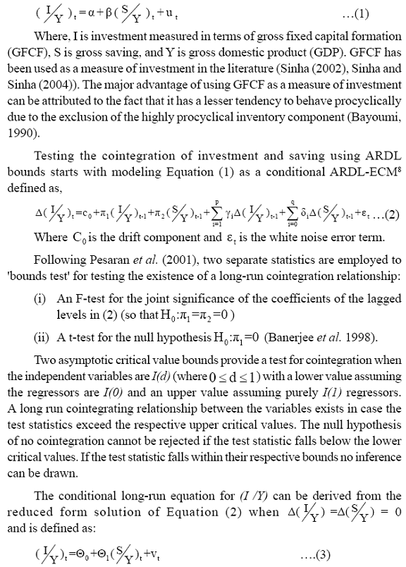 Bordoloi (2008) employing the Engle-Granger two-step method over the sample period from 1950-51 to 2005-06 found existence of cointegration relationship between saving and investment in India with a high coefficient. In a recent paper, Khundrakpamand Ranjan (2010) examined the F-H hypothesis for India for two separate periods using ARDL cointegration approach. The first period covers the period from 1950-51 to 1990-91 while the second period cover from 1950-51 to 2006-07, to examine the behavior of saving and investment post liberalisation of the Indian economy. The study found existence of a unidirectional cointegrating relationship from saving to investment and not vice-versa and the relationship was found to have weakened while incorporating post-liberalisation data. The various economic policies initiated by the Government of India post the Balance of Payments crisis in the early 1990s have gradually increased the flow of overseas saving into India leading to the weakening of the saving-investment relationship post 1990-91. Mishra et al. (2010) found existence of cointegration relationship between saving and investment for India over the period from 1950-51 to 2008-09 using annual data for the period 1950-51 to 2008-09 using the Johansen's cointegration technique. The study found bidirectional causality between the two variables.