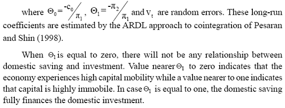 In contrast, when saving was considered as the dependent variable, the calculated F-statistics are found to be lower than the lower bound of the critical value at the 10 percent level, suggesting that the null of no cointegration between saving and investment could not be rejected for all the countries. Thus, existence of long-run relationship between saving and investment could be established, only in case when investment is considered as the dependent variable. This validates the use of investment as the dependent variable. Thus domestic saving is the long-run forcing variable for explanation of investment for the selected countries during the sample period.