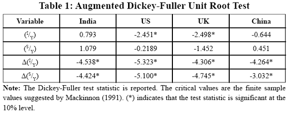 The ARDL bounds testing cointegration approach does not require the variables to be of the same order. However, we have used the ADF unit root tests to identify the order of integration (Table 1)10. From the table, it is clear that investment and saving are integrated of order one for China and India, while in case of US and UK, the test does not provide a clear picture of the order of integration. As the test gives an indication that the order of integration for both the variables for the four countries lie between zero and one, we preferred using ARDL bound testing approach.