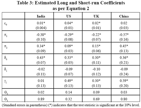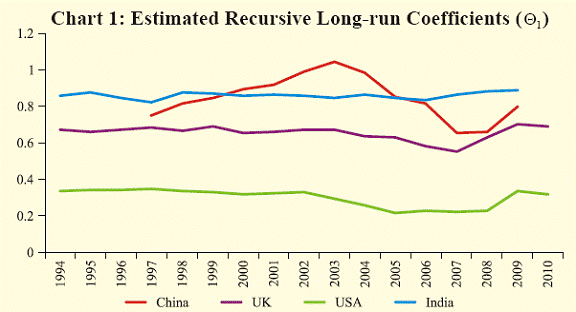 It can be noted that the long term saving coefficients are fairly stable for India which hovered around 0.85. In China, the long term coefficient of saving on investment gradually increased till 2003. This may be attributed to the high domestic saving driven investment. During 2004 to 2008, the coefficient declined. This is in line with the fact that the China's domestic savings grew at a faster rate (compounded annual growth rate of 21.2 per cent) than its investment growth (compounded annual growth rate of 19.2 per cent) during this period. Prior to the financial crisis of 2008, US and UK had witnessed decline in the long-run saving coefficients, which subsequently picked up during the crisis period (2008-09).