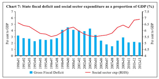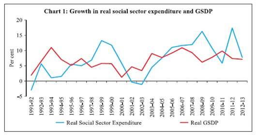 Balbir Kaur, Sangita Misra and Anoop K. Suresh* This paper attempts to study the cyclical behaviour of social sector spending including that on education and health for the 17 non-special category states covering the period 2000-01 to 2012-13. It finds that while overall social spending is acyclical in India at the state level, education spending is pro-cyclical, with the pro-cyclicality being more pronounced during upturns than it is during downturns. Further, the pro-cyclicality is more significant for bigger states (in terms of income) than it is for low income states. This possibly hints at the combined impact of political economy factors, pro-cyclical state revenues and the role of discretionary transfers. Fiscal deficit is observed to impact social sector expenditures negatively, providing support to the fiscal voracity effect hypothesis. In order to ensure that the low growth does not hamper human capital formation, states are expected to increase their social sector spending during difficult times. This would, however, require the building of adequate fiscal space during good times to enable them to spend more when required on human capital investments, which is the key to achieving long-term inclusive and sustainable development. JEL Classification: E32, H5, H62 Key words : Social Sector Expenditures, Business Cycles, Fiscal Deficit, Transfers Introduction Human capital is critically intertwined with economic growth, with education and health constituting its major components. Investment in education and health makes the labour force more productive, healthy, competitive and efficient, all of which taken together contribute to higher economic growth. In the backdrop of the global financial crisis, there is renewed focus on attaining social sustainability to achieve the objective of sustainable growth. In line with this objective, there is a greater emphasis on investment in human capital with a view to improving life expectancy, ensuring availability of human capital with appropriate skill sets to support business activity while in that process also helping to develop innovative capacity and entrepreneurship in an economy. Particularly, commenting on India, the World Development Report (WDR) 2013 observed that providing key services like health and education can help create the right jobs while also contributing to improved standards of living and inclusive growth. The use of policies with a focus on strengthening the human resource base is considered extremely relevant for India which is expected to contribute a significant proportion of the global labour force in the coming years. In the Indian context, development initiatives undertaken by planners have been driven by these concerns and are reflected in increasing importance being assigned to the provisioning of social services by the central and state governments since the inception of the Plan era. Public sector outlays on social services (both projected and actual realization) have been on the rise, with the increase being significant since the Sixth Five Year (FY) Plan. The public sector outlay on social services as a proportion of total expenditure more than doubled from 14.4 per cent in the Sixth FY Plan to 30.2 per cent in the Eleventh Plan and is projected at 34.7 per cent in the 12th FY Plan (Table 1). While there has been a steady increase in the share of social sector expenditure in total plan expenditure, which is noteworthy, total public sector expenditure1 on important social sector heads remains low when compared with international standards. The combined expenditure of the central and state governments in India on education is just about 3.3 per cent of GDP;2 while that on the health sector is even lower at 1.3 per cent of GDP. In contrast, countries of the European Union spend 5.5 per cent of GDP (from their general government account) on education and 7.5 per cent of GDP on health. Canada’s public spending on health alone is over 11 per cent of its GDP and that on education is nearly 5 per cent. Apart from the low public sector expenditure levels (relative to international standards), significant disparities persist across states when it comes to expenditure of state governments on social services in India. Available data indicates that the states lagging behind with regard to expenditure on social sector have not attempted to catch up with the better-performing states through higher allocations of expenditure for social sector which is a key contributor to human development outcomes. The per capita social sector expenditure in the laggard states remained significantly lower than that of the leading states, resulting in the persistence of disparities in human development indicators (HDI) across states during the 2000s (RBI 2013). | Table 1: Pattern of Plan Outlay on Social Services | | (₹ billion) | | Period | Outlay | Actuals | | Sixth Plan 1981-85 | 140.35 | 159.17 | | | (14.4) | (14.5) | | Seventh Plan 1985-1990 | 315.45 | 349.60 | | | (17.5) | (16.0) | | Eighth Plan 1992-97 | 790.12 | 888.07 | | | (18.2) | (18.3) | | Ninth Plan 1997-2002 | 1,832.73 | 1,945.29 | | | (21.3) | (20.6) | | Tenth Plan 2002-2007 | 3,473.91 | 4,365.29 | | | (22.8) | (27.0) | | Eleventh Plan 2007-12 | 11,023.27 | 11,975.76 | | | (30.2) | (32.6) | | Twelfth Plan 2012-17 | 26,648.43 | | | | (34.7) | | | Note: Figures in brackets indicate percentage to total plan outlay. | Given the importance of social sector expenditure in the Indian context, it is not only pertinent to analyse the trends in social sector expenditures (including education and health) over a period of time but also to examine their response to situations of economic volatility in general and growth slowdown in particular. There are two reasons for this. First, the conventional Keynesian argument that holds for any kind of public sector expenditure as a counter-cyclical tool holds for social sector expenditure as well. An increase in social spending could form p