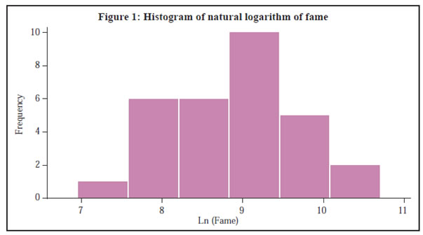 In this process, the fame proxy is rescaled to a relative achievement scale. This normalized scale is bounded in the unit interval. This procedure provides us with a crude proxy for estimating the relative achievements of potential Nobel winners. We select 30 economists for our analysis. We proxy fame by the number of ‘citations’ on Microsoft Academic Search. However, fame can be a noisy estimate, simply because the fame of a person can also be because of the fame of namesake(s). To minimize this noise, we searched the intersection of the specific name format for the economist (as provided in Table 3) and the field of study ‘economics and business’. Owing to this, the number of hits got severely restricted. Given this constraint, this ensured a uniform restriction for every chosen individual. On 2 June 2014, we searched Microsoft Academic Search using this criteria and found that Andrei Ikjkl Shleifer led the ranking with nearly 45,000 citations (i.e, Fmax). At the other end of the list is Anne Krueger (i.e, Fmin).9 Chart 1 shows the histogram of Ln(Fame). The number of ‘hits’ appears to be skewed. In other words, a unit of extra achievement leads to a disproportionate increase in fame.10 The table of relative achievements appears to suggest that a significant number of those in the list are those with influence well beyond the realms of academia (Table 3).
