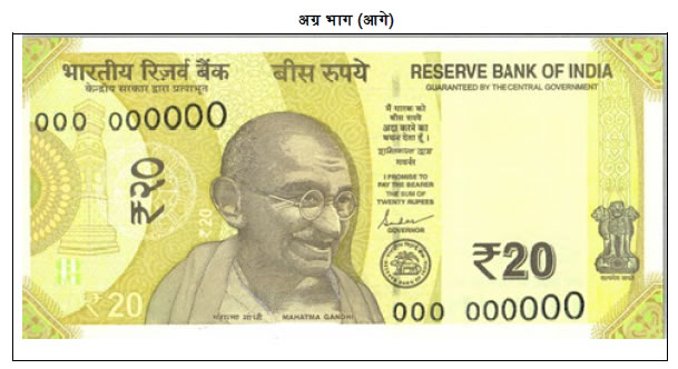 भारतीय रिजर्व बैंक जल्दी ही महात्मा गांधी (नई) शृंखला में ₹ 20 का बैंक नोट जारी करेगा जिस पर भारतीय रिजर्व बैंक के गवर्नर श्री शक्तिकान्त दास, के हस्ताक्षर होंगे । नए मूल्यवर्ग के बैंक नोट के पृष्ठ भाग पर एलोरा गुफाओं का चित्र है जो देश की सांस्कृतिक विरासत का चित्रण करता है । नोट का आधार रंग हरा सा पीला है । नोट के अग्र तथा पृष्ठ दोनों भागों पर अन्य डिजाइन, ज्यामितिक पैटर्न हैं जिन्हें समग्र रंग योजना के साथ संरेखित किया गया है ।