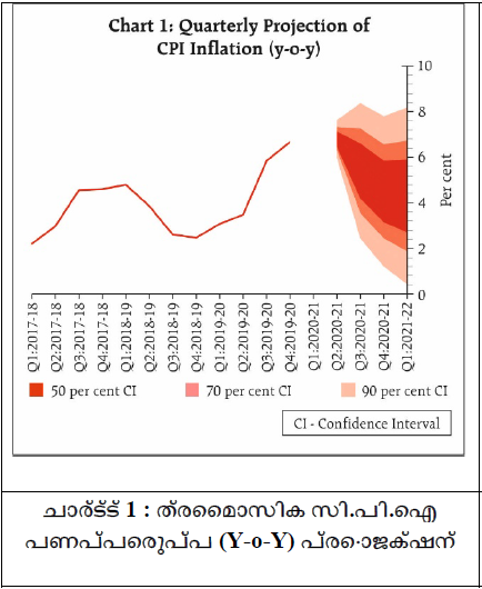 10. പണപ്പെരുപ്പത്തിന്റെ ഭാവി വീക്ഷണത്തിലേയ്ക്കു വന്നാല്, ഖാരിഫ് വിതയ്ക്കൽ ഭക്ഷ്യവിലകള്ക്ക് അസാധാരണമാം വിധം നന്നായിരിയ്ക്കുമെന്നാണ് കാണുന്നത്. പ്രധാന പച്ചക്കറികളായ തക്കാളി, ഉള്ളി, ഉരുളക്കിഴങ്ങ് എന്നിവയുടെ വിലയിന്മേലുള്ള സമ്മർദ്ദങ്ങളും ഖാരിഫ് വിളകളുടെ വരവോടുകൂടി മൂന്നാം പാദത്തില് പിന്വാങ്ങുക തന്നെ ചെയ്യും. നേരെമറിച്ച്, പയർവർഗ്ഗങ്ങളുടെയും എണ്ണക്കുരുക്കളുടെയും വിലകള് കൂടിയ ഇറക്കുമതി തീരുവകള് കാരണം മിക്കവാറും സ്ഥിര നിലവാരത്തില് തന്നെ തുടരുന്നതായിരിക്കും. അന്താരാഷ്ട്ര ക്രൂഡ് ഓയില് വിലകള് ദുര്ബലമായ ആവശ്യകതാവീക്ഷണത്താല് സെപ്തംബറില് സാവധാനം കുറയുവാനുള്ള പ്രേരണയോടുകൂടിയാണ് കച്ചവടം നടക്കുകയുണ്ടായത്. എന്നാല് ആഭ്യന്തര പമ്പുകളിലെ വിലകള് നികുതികളുടെ ഏതുവിധത്തിലെങ്കിലും ഉള്ള തിരിച്ചുപോക്കിന്റെ അഭാവത്തില് ഉയര്ന്നു തന്നെ ആയിരിക്കും നില്ക്കുക. സ്ഥാപനങ്ങളുടെ വില തീരുമാനിയ്ക്കുവാനുള്ള ശക്തി മെരുക്കപ്പെട്ട ആവശ്യകതയുടെ മുന്പില് തീരെ ദുര്ബലമാണ്.തൊഴിലാളി ക്ഷാമം, ഉയര്ന്ന ചരക്കുനീക്കകൂലികള് ഉള്പ്പെടെയുള്ള കോവിഡ്-19 നുമായി ബന്ധപ്പെട്ട വിതരണ തടസ്സങ്ങള് ചെലവുകളെ മുന്പോട്ടു കൊണ്ടുപോകുന്ന സമ്മര്ദ്ദങ്ങള് തുടര്ന്നും അടിച്ചേല്പ്പിക്കുമെങ്കിലും ഈ അപകടങ്ങള്, തുടരുന്ന ലോക്ഡൌണ് ഇളവുകളും അന്തര്സംസ്ഥാന പോക്കുവരവുകളിലുള്ള നിയന്ത്രണങ്ങളുടെ ഒഴിവാക്കലുകളും കൊണ്ട് ലഘൂകരിക്കപ്പെട്ടുകൊണ്ടിരിയ്ക്കുന്നു. ഈ ഘടകങ്ങളെല്ലാം പരിഗണിച്ചും റിസ്ക്കുകളെ വിശാലമായി സന്തുലനം ചെയ്തും (ചാര്ട്ട് 1) സി.പി.ഐ പണപ്പെരുപ്പം 2020-21 ന്റെ രണ്ടാം പാദത്തില് 6.8 ശതമാനമായും 2020-21 ന്റെ രണ്ടാം അര്ദ്ധവര്ഷത്തില് 5.4 - 4.5 ശതമാനമായും 2021-22 ന്റെ ഒന്നാം പാദത്തില് 4.3 ശതമാനമായും ആണ് പ്രൊജക്റ്റ് ചെയ്തിട്ടുള്ളത്.