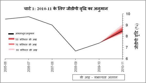 31. 2010-11 में विकास के और ऊँचे जाने की संभावना को देखते हुए वास्तविक जीडीपी का आधार अनुमान, जैसा कि जुलाई 2010 की दूसरी तिमाही समीक्षा मे कहा गया था, 8.5 प्रतिशत पर रखा गया है, पर ऊर्ध्वमुखी प्रवृत्ति लिए हुए (चार्ट 1). ।