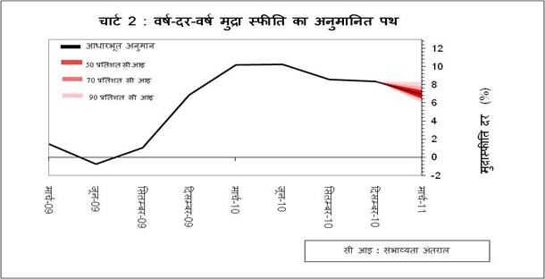 38. नबम्बर 2010 के दूसरी तिमाही समीक्षा में रिजर्व बैंक ने नए डब्ल्यूपीआइ (2004-05=100) के आधार पर मार्च 2011 के लिए डब्ल्यूपीआइ मद्रास्फीति का बेसलाइन पूर्वानुमान 5.5 प्रतिशत रखा था। दिसम्बर 2010 के मध्य तिमाही समीक्षा में मुद्रास्फीति में बढ़ोतरी की संभावना का संकेत दिया गया था। धातुओं और अनियंत्रित/ गैर-प्रशासित ईंधन (नॉन एडमिनिस्टर्ड फ्यूअल) की कीमतों में बढ़ोतरी को देखें तो ये आशंकाएं सही साबित हुई हैं। आपूर्ति में भी कुछ अल्पकालिक आघात सामने आए जैसा कि सब्जियों की कीमतों में तीव्र वृद्धि में देखने को मिला। इसके अलावा पेट्रोलियम और हवाई ईंधन की कीमतें जनवरी के आरंभ में बढ़ी हुई थीं जिसका डब्ल्यूपीआइ मुद्रास्फीति में 9 आधार अंकों का योगदान होगा। हालांकि अल्पकालिक कारकों के प्रभाव में क्रमश: कमी होने की संभावना है, पर कुछ वस्तुओं के मांग-आपूर्ति के असंतुलन के कारण कीमतों पर दबाव बने रहेंगे। अब तक की हुई बढ़ोतरी और उभरते घरेलू और बाह्य परिदृश्य को ध्यान में रखते हुए मार्च 2011 के डब्यूपीआइ मुद्रास्फीति के बेसलाइन पूर्वानुमान को 5.5 प्रतिशत से बढ़ाकर 7.0 प्रतिशत किया जाता है( चार्ट 2).।