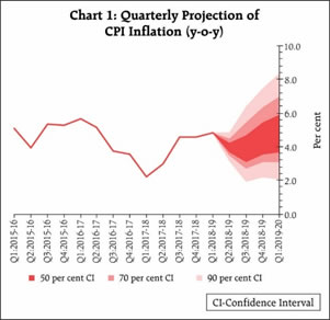 23. आगे बढ़ते हुए, मुद्रास्फीति दृष्टिकोण कई कारकों से प्रभावित होने की उम्मीद है। सबसे पहले, खाद्य मुद्रास्फीति असामान्य रूप से सौम्य बनी हुई है, जो वर्ष के दूसरे छमाही में अपने ट्रेजेक्टरी के लिए नीचे की ओर पूर्वाग्रह प्रदान करती है। दालों, खाद्य तेलों, चीनी, फलों और सब्जियों जैसे प्रमुख खाद्य पदार्थों में मुद्रास्फीति इस समय असाधारण रूप से नरम बनी हुई है। स्थानिक और अस्थायी रूप से असमान वर्षा से खाद्य मुद्रास्फीति का जोखिम भी कम हो गया है, जैसा कि प्रथम अग्रिम अनुमानों में पिछले वर्ष की तुलना में 2018-19 के लिए प्रमुख खरीफ फसलों का उत्पादन अधिक होने की पुष्टि की गई है। जुलाई में घोषित न्यूनतम समर्थन मूल्यों (एमएसपी) में वृद्धि के प्रभाव का अनुमान बेसलाइन अनुमानों में लगाया गया है । दूसरा, पिछले संकल्प के बाद कच्चे तेल की भारतीय बास्केट की कीमत तेजी से 13 अमेरिकी डॉलर प्रति बैरल हो गई है। तीसरा, अंतरराष्ट्रीय वित्तीय बाजार ईएमई करेंसी के साथ काफी हद तक कमजोर रहे। अंत में, एचआरए प्रभाव जून में अपने चरम पर आया और धीरे-धीरे अपेक्षित लाइनों पर विलुप्त हो रहा है। इन सभी कारकों को ध्यान में रखते हुए, मुद्रास्फीति ति2: 2018-19 में 4.0 प्रतिशत, एच2 में 3.9-4.5 प्रतिशत और ति1: 2019-20 में 4.8 प्रतिशत, कुछ हद तक जोखिम के साथ अपसाइड रहने का अनुमान है (चार्ट 1)। एचआरए प्रभाव को छोड़कर, सीपीआई मुद्रास्फीति ति2: 2018-19 में 3.7 प्रतिशत, एच2 में 3.8 - 4.5 प्रतिशत और ति1:2019-20 में 4.8 प्रतिशत अनुमानित है।