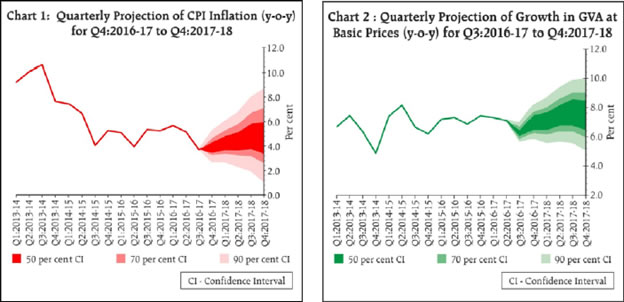 17. दिसंबर के पाँचवे द्विमासिक वक्तव्य में 2016-17 की चौथी तिमाही में हेडलाइन मुद्रास्फीति का 5 प्रतिशत पर अनुमानित की गई जिसमें जोखिम पहले से कम थे किंतु इनका झुकाव ऊपर की ओर था। नवंबर तथा दिसंबर में मुख्य सीपीआई मुद्रास्फीति में गिरावट अपेक्षा से कहीं अधिक थी परंतु यह पूरी तरह सब्जियों और दालों में अपस्फीति के आधार पर था। सब्ज़ी के मूल्यों में मौसमी कमी जो सामान्यत: शीत ऋतु के आगमन पर होती है और मांग में संकुचन के कारण ऐसा हुआ हो, उपाख्यानात्मक सबूत इंगित करते हैं कि कतिपय नष्ट होने वाले माल की आपात बिक्री के कारण सब्ज़ी की कीमतों में गिरावट को बल मिला जिसका प्रभाव जनवरी में भी जारी रहा। इसके अलावा, विमुद्रीकरण का प्रभाव घटने पर दालों की कीमतों में सुलभ आपूर्ति स्थितियों के साथ गिरावट बनी रहेगी, जबकि सब्ज़ी की कीमतों में उछाल संभव है।