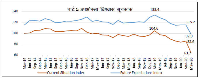 I. वर्तमान स्थिति सूचकांक (CSI) के अपने ऐतिहासिक निम्न को छूने तथा एक वर्ष आगे की भावी अपेक्षाओं के सूचकांक (FEI)2 में तीव्र गिरावट के चलते मई 2020 में उपभोक्ता विश्वास निराशावादिता के क्षेत्र में प्रवेश कर गया (चार्ट 1)।