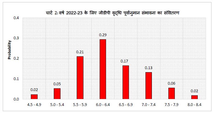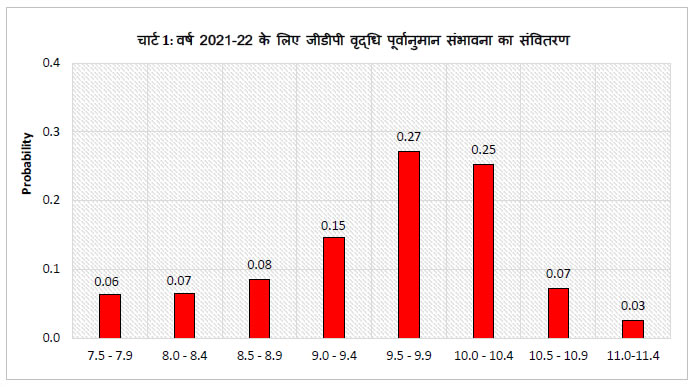 पूर्वानुमानकर्ताओं ने वर्ष 2021-22 में वास्तविक जीडीपी वृद्धि की उच्चतम संभावना 9.5- 9.9 प्रतिशत के बीच, इसके बाद 10.0- 10.4 प्रतिशत की सीमा के बीच दी है (चार्ट 1)। वर्ष 2022-23 के लिए जीडीपी वृद्धि की उच्चतम संभावना 6.0- 6.4 प्रतिशत के बीच दी गई है (चार्ट 2)।