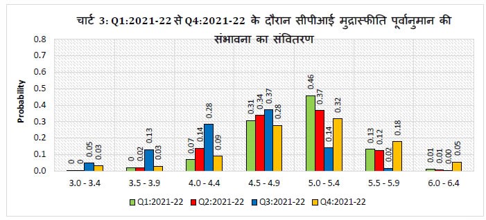 हेडलाइन उपभोक्ता मूल्य सूचकांक (सीपीआई) मुद्रास्फीति दर 2021-22 की पहली दो तिमाहियों के दौरान 5.0 प्रतिशत और उसके बाद Q3:2021-22 में कम होकर 4.4 प्रतिशत रहने की उम्मीद है (सारणी 3)। Q4:2021-22 के लिए मुद्रास्फीति अनुमान 5.1 प्रतिशत रहने की संभावना है ।