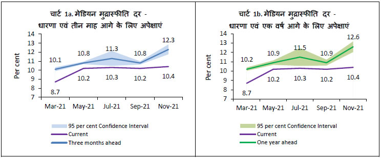 i. नवंबर 2021 मे मौजूदा अवधि के लिए परिवारों की मीडियन मुद्रास्फीति धारणा में 20 आधार अंकों की वृद्धि होकर यह 10.4 प्रतिशत थी जबकि पिछले सर्वेक्षण चक्र की तुलना में, तीन महीने और एक वर्ष आगे की मीडियन मुद्रास्फीति प्रत्याशाओं में क्रमशः 150 और 170 आधार अंक की वृद्धि हुई [चार्ट 1a और 1b; तालिका 3(a)]।