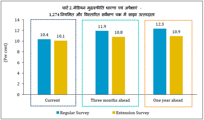 v. दिसंबर 2021 की शुरुआत में किए गए विस्तारित सर्वेक्षण में प्रत्युत्तर देने वाले परिवारों की मीडियन मुद्रास्फीति की धारणा एक महीने पहले आयोजित नियमित सर्वेक्षण चक्र में उनके आकलन की तुलना में मौजूदा मुद्रास्फीति के लिए 30 आधार अंकों की गिरावट आई है [चार्ट 2; तालिका 3(b)]।