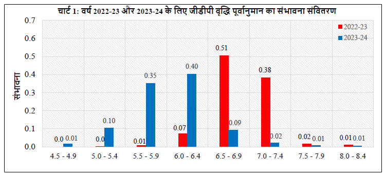 पूर्वानुमानकर्ताओं ने वर्ष 2022-23 में वास्तविक जीडीपी वृद्धि की उच्चतम संभावना 6.5-6.9 प्रतिशत के बीच दी है (चार्ट 1)। वर्ष 2023-24 के लिए, उच्चतम संभावना 6.0-6.4 प्रतिशत के बीच दी है।