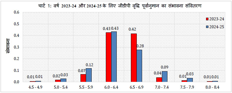 पूर्वानुमानकर्ताओं ने वर्ष 2023-24 में वास्तविक जीडीपी वृद्धि की उच्चतम संभावना 6.0-6.9 प्रतिशत की विस्तृत सीमा में दी है और वर्ष 2024-25 के लिए 6.0-6.4 प्रतिशत के बीच दी है (चार्ट 1)।