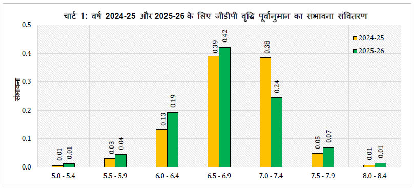 पूर्वानुमानकर्ताओं ने वर्ष 2024-25 के लिए 6.5-7.4 प्रतिशत और वर्ष 2025-26 के लिए 6.5-6.9 प्रतिशत की सीमा में वास्तविक जीडीपी वृद्धि की उच्चतम संभावना दी है (चार्ट 1)।