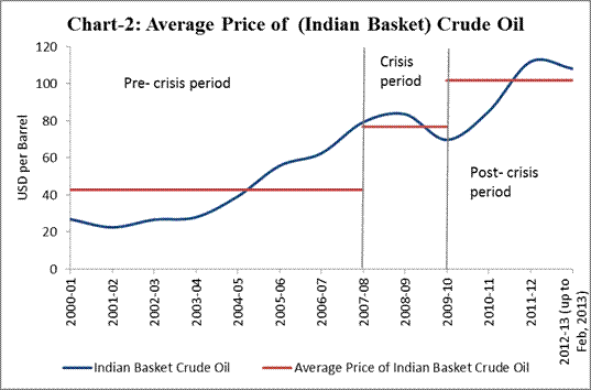 9. Given the tepid recovery of advanced economies from the crisis and consequent sluggish demand, the expectation was that global prices of commodities, especially of crude, would remain soft. On the contrary, commodity prices have surged compared to the pre-crisis period (excluding the highly volatile two years of the crisis) and have remained firm at that level (Chart - 2).