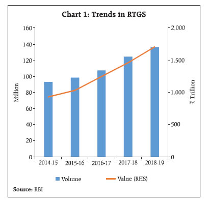 the Indian payment system is poised to fulfil the goals envisaged in the Reserve Bank’s Vision Document 2019-21. According to the Report on Benchmarking India’s Payment Systems (RBI, 2019b), India has a leading/ strong position in terms of several parameters pertaining to digital transaction, technology infrastructure, and payment and settlement laws and regulation. At the same time, there exists vast potential for growth of digital transactions in India owing to low per capita quantum currently. References Anand, Sahil (2018). ‘US Fintech trends: 2018: the year of digital banking,’ IBS Intelligence, October 16. Auer, Raphael (2019). ‘Beyond the doomsday economics of proof-of-work in cryptocurrencies,’ BIS Working Papers No. 765. Basel Committee on Banking Supervision (BCBS) (2018). ‘Sound Practices: implications of fintech developments for banks and bank supervisors’. Carstens, Agustín (2019). ‘The future of money and payments,’ Ninth Whitaker Lecture at Dublin, March 22. Conesa, Carlos (2019). ‘Bitcoin: A Solution for Payment Systems or a Solution in Search of a Problem?,’ Bank of Spain Occasional Documents No. 1901. Ernst and Young (EY) (2017). FinTech Adoption Index - the rapid emergence of FinTech. Financial Times (2019). ‘Growing payments firms may pose a systemic risk,’ March 21. Financial Stability Board (FSB) (2019). ‘FinTech and market structure in financial services: Market developments and potential financial stability implications’. Lee, Georgina (2019). ‘Chinese banks boost fintech spending and launch services to counter competition from internet giants,’ South China Morning Post, April 5. Lipton, David (2019). ‘A Balanced Approach to Fintech Regulation and Innovation—at Home and Abroad,’ Opening Remarks for the 2nd IMF Fintech Roundtable, April 1. Manalo, K. (2018), ‘People’s Bank of China Pilots Trade Finance Blockchain Platform’, Cryptovest, September 5. Menon, Ravi (2018). ‘Singapore FinTech Festival-innovation, inclusion, inspiration,’ Presentation given at Singapore FinTech Festival, November 12. Mersch, Yves (2019). ‘Lending and payment systems in upheaval: the fintech challenge,’ speech given at the 3rd Annual Conference on Fintech and Digital Innovation in Brussels. Ramsden, Dave (2018). ‘The Bank of England – Open to Fintech,’ speech given at HMT’s International Fintech Conference in London, March 22. Reserve Bank of India (2019a) The Report of High Level Committee on Deepening of Digital Transactions, Chairman: Shri Nandan Nilekani, May 17, 2019. Reserve Bank of India (2019b), Report on Benchmarking India’s Payment Systems, June 4, 2019. United Nations Secretary-General’s Special Advocate, (UNSGSA) (2019). Early Lessons on Regulatory Innovations to Enable Inclusive FinTech. ANNEX Select Payment Services in India | Payment Service | Description | Launch Date | Operator | | Electronic Funds Transfer | One to one fund transfer facility. This system has been replaced by more efficient NEFT system for use by the general public. | 1997 | RBI | | Real Time Gross Settlement (RTGS) | Settlement of fund transfer orders occurs individually on a continuous and real-time basis. Minimum amount for customer transactions is ₹2 lakh. No upper limit. Available from 8 am to 6 pm for customer transactions and 8:00 am to 7:45 pm for interbank transactions on working days. | 2004 | RBI | | National Electronic Fund Transfer (NEFT) | One to one fund transfer with half-hourly net settlement. No minimum or maximum limit. Available from 8 am to 7 pm on working days. | November 2005 | RBI | | National Electronic Clearing Service (NECS) | NECS (Credit) facilitates multiple credits to beneficiary accounts with destination branches across the country against a single debit of the account of the sponsor bank. | October 2008 | RBI | | Credit & Debit Cards | PoS terminals which enable customers to make payments for purchases of goods and services by means of credit/debit cards. To facilitate customer convenience, the Reserve Bank has also permitted cash withdrawal using debit cards issued by the banks at PoS terminals and ATMs. | November 2009 | Banks | | PPIs (Cards & Wallets) | Pre-paid instruments are payment instruments that facilitate purchase of goods and services against the value stored on these instruments. The value stored on such instruments represents the value paid for by the holders by cash, by debit to a bank account, or by credit card. The pre-paid payment instruments can be issued in the form of smart cards, magnetic stripe cards, internet accounts, internet wallets, mobile accounts, mobile wallets, paper vouchers, etc. | 2009 | PPI Operators | | IMPS | Round the clock peer-to-peer fund transfer facility with immediate money transfer through multiple channels like Mobile, Internet, ATM, SMS, Branch and USSD. | November 2010 | NPCI | | NACH | Web-based solution to facilitate interbank, high volume, electronic transactions which are repetitive and periodic in nature. | 2011 | NPCI | | Cheque Truncation System (CTS) | CTS is the process of stopping the physical movement of cheques. As per the amended Negotiable Instruments Act 1881, in cheque truncation, the movement of the physical instrument is stopped and replaced by electronic images and associated MICR line of the cheque. | 2011 | NPCI | | Aadhaar-enabled Payment System | Basic banking transactions can be done at Micro ATM of the Business Correspondent of any bank using Aadhaar authentication. | January 2016 | NPCI | | UPI | Peer-to-peer fund transfer facility with immediate money transfer through mobile device round the clock 24*7 and 365 days. BHIM app supports multiple bank accounts into a single mobile application. Upper limit is ₹2,00,000. | August 2016 | NPCI | | National Electronic Toll Collection | NPCI has developed the National Electronic Toll Collection (NETC) programme to meet the electronic tolling requirements of the Indian market. It offers 