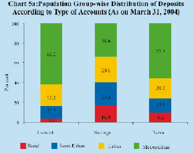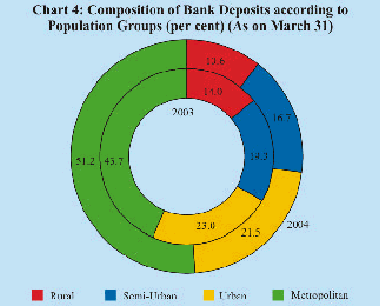 - The metropolitan areas accounted for the major share of 51.2 per cent in total deposits, while the deposits of rural, semi-urban and urban areas accounted for much lower shares of 10.6 per cent, 16.7 per cent and 21.5 per cent, respectively as on March 31, 2004. The ‘Household sector’ accounted for the highest share in total deposits in each of the population groups, although its share was highest at 85.3 per cent in rural areas, and lowest at 45.0 per cent in metropolitan areas as on March 31, 2004. The ‘Government sector’ held a substantially higher share at 18.6 per cent in metropolitan areas compared to its share in other population groups as on March 31, 2004. The share of ‘Private Corporate sector (Non-financial)’ in total deposits of the metropolitan areas was at 13.6 per cent.