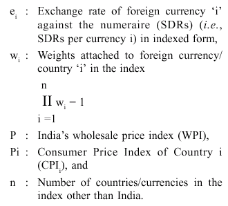 Where e : Exchange rate of Indian rupee against a numeraire,