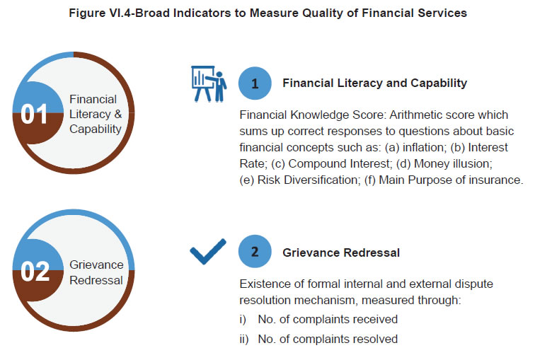 Going forward, the availability of consistent, reliable and internationally comparable gender disaggregated data is vital to focus attention on policies that could help close the gender gap on women’s access to formal financial services. Further, an understanding of the existence of regional variation and imbalances on women’s access to financial services across the country would also help in coming up with suitable policy interventions that can eventually help women achieve economic wellbeing through managing their household finances optimally. VI.5 Quantifying financial inclusion progress is usually undertaken across the three dimensions of access, usage and quality. VI.6 Access Indicators show the details pertaining to access points in the form of Banking Outlets (Bank Branches, Business Correspondent outlets), Automated Teller Machines (ATMs) and Point of Sale (PoS) terminals. The access parameters can be represented both in terms of geography (e.g number of banking outlets per 1000 sq km) as well as demography (e.g number of banking outlets per 100000 adult population). Typically, data for access indicator is obtained from the data available with the Government/ Regulators. VI.7 Usage Indicators show how the products are being used by the target customers. Data for usage can be collected through primary and secondary sources. While data on number of accounts, products, etc. can be collected from financial service providers, insights into the usage of different financial products and services may be obtained through surveys/ feedback from customers.  VI.8 The Quality indicators describe the supporting pillars that ensure that the customers can use the financial services to their satisfaction. For example, financial literacy and capability is an important enabler to help customers make right choices. However, lack of proper service by the provider may result in dissatisfaction to the customer which may result in financial exclusion. Since quality also involves the dimension of subjectivity, it is essential to have a well-defined metric that allows for certain flexibility while capturing data. Measuring quality under financial inclusion can include financial literacy and capability, clarity and transparency in the communication of the service provider, customer satisfaction, availability of grievance redressal process and timely redressal mechanisms. VI.9 An illustration of Financial Inclusion Indicators is presented below: | Sl No | Category | Indicator | Formula | | Access | | 1 | Physical points of service | No. of banking outlets per 100,000 adults | Total No. of banking outlets –––––––––––––––––––––––– X 100000 Total adult population | | 2 | No. of ATMs per 100,000 adults | Total No. of ATMs –––––––––––––––––––– X 100000 Total adult population | | 3 | No. of Depository Participant Service Centres Across the Country per 100,000 adults | Total No. of Depository Participant Service Centres ––––––––––––––––––––––––––––––––––––––––––––– X 100000 Total adult population | | 4 | No. of Mutual Fund Distributors’ per 100,000 adults | Total No. of Mutual Fund Distributors ––––––––––––––––––––––––––––––––– X 100000 Total adult population | | Usage | | 5 | Formally banked adults | Percentage of adults with a savings bank account | Total No. of adults with savings bank account ––––––––––––––––––––––––––––––––––––––– X 100 Total adult population | | 6 | Formally banked women | Percentage of women having a savings bank account | Total No. of Women with a saving bank account –––––––––––––––––––––––––––––––––––––––––– X 100 Total Women population | | 7 | Formally banked MSMEs | Percentage of MSMEs having access to bank credit | MSMEs with access to bank credit –––––––––––––––––––––––––––––––– X 100 Total Number of MSMEs | | 8 | Formally banked Agricultural Sector | Percentage of SMF having access to bank credit | Total Number of SMF with access to bank credit ––––––––––––––––––––––––––––––––––––––––– X 100 Total Number of SMFs | | 9 | Adults with pension | Percentage of adults having pension policy (includes NPS and APY) | Total No. of adults with pension accounts –––––––––––––––––––––––––––––––––––– X 100 Total adult population | | 10 | Adults with life insurance | Percentage of adults having life insurance product | Total No. of adults with life insurance ––––––––––––––––––––––––––––––––– X 100 Total adult population | | 11 | Adults with non- life insurance | Percentage of adults having non- life insurance product | Total No. of adults with non- life insurance –––––––––––––––––––––––––––––––––––– X 100 Total adult population | | 12 | Adults with Credit Product | Percentage of Adults having credit product from banks | No. of adults with credit product from banks –––––––––––––––––––––––––––––––––––– X 100 Total adult population | | 13 | Adults with Mutual Fund Products (Folios) | Percentage of Adults having Mutual Fund Products (Folios) | No. of adults with Mutual fund Products (Folios) ––––––––––––––––––––––––––––––––––––––––– X 100 Total adult population | | 14 | Adults with Demat Accounts | 