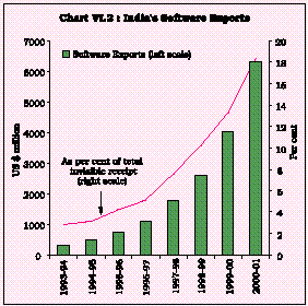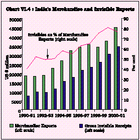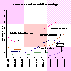 Box VI.2 Trade in Services: An Engine of Growth Since the 1980s, an important development in international trade has been the growing trade in services. This reflects partly the increasing importance of tertiary activities the world over. A far more important factor underlying the increased importance of services in international trade has been the revolution in information technology in the 1990s which has reduced the time as well as cost of transport and communication. As a result, services, hitherto considered as non-tradable, have entered the arena of tradability. The rapid rise in the share of the services sector in the structure of national economics as well as in world trade has been particularly beneficial for the developing economies given the labour-intensive nature of most services. The 1990s have, therefore, broadened the scope for diversification in favour of trade in services. Another factor providing an impetus to internationalisation of services has been the changing character of capital flows, particularly the shift towards private capital flows in the form of foreign direct investment flows. Service activities like banking and insurance have attracted increasing FDI investment worldwide. Reflecting the IT revolution, the share of IT goods in world trade has increased from 7.5 per cent in 1990 to 11 per cent in 1999. At the same time, the rapid growth of IT production and the use of IT-related services around the world have raised concerns about cross-border propagation of business cycles. The orderly development of international trade in services was expected to be enhanced by the adoption of the General Agreement on Trade in Services (GATS) in 1993. The barriers to international trade in services, however, remain high and opaque. These barriers emerge from the fact that a large part of the services trade involves movement of labour and capital across borders, both of which continue to confront restrictions on movement. IMF estimates indicate that gains from liberalisation of services trade would be about US $ 1,181 billion, almost double the gains that would emanate from liberalisation of merchandise goods (US $ 677 billion), highlighting the welfare-enhancing potential of liberal trade in services ( Table 6.2).The general paradigm shift in services trade in the 1990s also helped in the emergence of new sources of forex earnings in the services account in India’s balance of payments, providing a significant source of comfort. While the period up to the 1980s was dominated by tourism earnings, the second half of the 1990s witnessed an unprecedented jump in India's earnings from newer activities like software service exports and other IT-related skill-intensive exports. Earnings from software exports have increased from negligible levels in early 1990s to US $ 6.3 billion in 2000-01, accounting for almost one-fifth of India's gross invisible earnings (Chart VI.2). At the same time, remittances - the single most important source of India's invisible earnings - have continued to remain strong, growing more than 6-fold from US $ 2 billion at the start of 1990s to almost US $ 13 billion by 2000-01, forming 2.7 per cent of GDP (Chart VI.3). Table 6.2 : Welfare Gains from Post-Uruguay Round Trade Liberalisation | | | | (In billions of US dollars at 1995 exchange rates and prices) |
