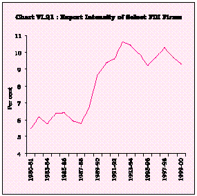 6.43 It is difficult to assess the direct contribution of these flows, particularly FDI, to the growth process. Anecdotal evidence suggests that foreign-controlled firms often use third-party exports to meet their export obligations (Athreye and Kapur, 2001). Another factor that contributes to widening the technology gap in FDI in India is the inappropriate Intellectual Property (IP) regime of India. Survey results for 100 US multinationals indicate that about 44 per cent of the firms highlighted the weak IP protection in India as a constraining factor for transfer of new technology to Indian subsidiaries. For investment in sectors like chemicals and pharmaceuticals, almost 80 per cent of the firms viewed Indian IP regime as the key constraining factor for technology transfer (Lee and Mansfield, 1996). Information collected from annual surveys of select Foreign Controlled Rupee Companies (FCRCs)/FDI companies on the export intensity of FCRC/FDI firms during the 1980s and the 1990s shows that these firms export only about 10 per cent of their domestic sales and the export-intensity has increased only modestly in the 1990s. It appears that the lure of the large size of the domestic market continues to be one of the primary factors causing FDI flows into India (Chart VI.21).