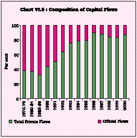 IV. CAPITAL FLOWS AND GROWTH IN INDIA : THE RECENT EXPERIENCE 6.33 Capital flows into India have been predominantly influenced by the policy environment. Recognising the availability constraint and reflecting the emphasis on self-reliance, planned levels of dependence on foreign capital in successive Plans were deliberately held at modest levels (Table 6.4). Economy in the recourse to foreign capital was achieved through import-substitution industrialisation in the initial years of planned development. The possibility of exports replacing foreign capital was generally not explored until the 1980s. It is only in the 1990s that elements of an export-led growth strategy became clearly evident alongside compositional shifts in the capital flows in favour of commercial debt capital in the 1980s and in favour of non-debt flows in the 1990s. The approach to liberalisation of restrictions on specific capital account transactions, however, has all along been against any "big-bang" (Box VI.4). Box VI.4 Role of Capital Controls in Stabilising the Growth Process The debate centering around the perceived benefits of an open capital account, on the one hand, and the observed advantages of selective capital controls in stabilising the growth process, on the other, has prompted national authorities to undertake capital account liberalisation at varied pace and sequencing, depending on country-specific circumstances. A review of country experiences suggests that countries impose capital controls for a variety of reasons, i.e., to (a) protect infant industries - a second best solution whereby the authority introduces an off-setting distortion to correct some other pre-existing distortions that cannot be corrected otherwise; (b) increase the effectiveness of monetary policy; (c) limit exposure to risks (such as transfer risk, sovereign risk, and country risk); (d) avoid the costs of sterilisation; (e) limit the potentially destabilising effects of volatile capital flows; (f) enable monetary authorities to pursue managed exchange rate regimes; (g) reduce domestic financial system vulnerability by substituting for (absent or underdeveloped) prudential standards; (h) provide breathing space for entrenching the preconditions for an open capital account; and (i) restructure capital flows in favour of non-debt and longer maturity flows. Capital controls, however, have certain negative implications. They may lead to inefficient allocation of resources with implications for productivity. Capital controls limit the substitutability between domestic and foreign assets and introduce a systematic wedge between domestic and foreign interest rates. Controls on outflows may depress domestic interest rates with adverse implications for domestic saving. Differential reserve requirements on banks' domestic vis-a-vis foreign currency liabilities are discriminatory, impairing the efficiency of monetary policy. By limiting adjustment to the quantity variable, the burden of adjustment of a shock on the investor's portfolio allocation results in increased volatility of the exchange rate/equity prices. Capital controls entail administrative costs, and render accessibility to desirable forms of foreign capital difficult and costly. Many countries have also resorted to capital controls as a soft option, preferring it to the implementation of difficult measures of financial sector reforms that would have otherwise proved beneficial in the long run. In significant measure, the resort to capital controls also reflects the gaps in the international financial architecture, which have made the resolution of capital account crises costly, inequitable and contagious. Prior to the Asian crisis, the IMF generally discouraged imposition of capital controls. An implicit assumption in the exercise of its responsibility for international monetary and financial stability was that private sector capital markets usually do not 'get it wrong' in deciding the right amount and right composition of capital flows to a country. Accordingly, the IMF had recommended further improvements in market discipline to promote private capital flows (Goldstein and Mussa, 1993). Even as late as in October 1997, the Fund's World Economic Outlook had recommended further liberalisation of the capital account noting the linkage between 'rapid growth and large capital inflows'. Although developing countries may experience increased volatility, this should be managed without imposing capital controls with greater exchange rate flexibility to deal with such flows (IMF, October 1997). In the post South-East Asian crisis period, the IMF recognised the role of capital controls. The Fund's initial criticism of Malaysia's re-imposition of exchange and capital controls in September 1998 as an 'important set-back not only to that country's recovery and potentially to its future development, but also to other emerging market economies that have suffered from heightened investor fears of similar actions elsewhere' (IMF, October 1998) has undergone a progressive transformation with an acknowledgement that 'controls appear to have provided some breathing space in which to implement more fundamental reforms' (IMF, October 2001). Capital controls on short-term capital inflows by Chile to increase the potency of monetary policy also found favour with the IMF. It acknowledged the existence of 'important preconditions for an orderly liberalisation of capital movements' and also recognised the inability of the market participants to appropriately assess the risks of investing in emerging markets leading to excessive volatility in capital flows (IMF, 1998; Mussa, 2000). The IMF's current view on capital account liberalisation resembles the Indian approach. For countries with comparatively weak financial systems, maintenance of some restrictions on private capital flows (at least for some period of time) has been recognised as a desirable option. Empirical studies find a weak positive relatio