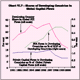 Following the financial crisis of 1997, private capital flows to emerging markets declined from a peak of $ 344 billion in 1997 to $ 280 billion in 1998 and further to $ 219 billion in 1999. The fall was particularly sharp for market-based flows (bank loans, bonds and equity) owing to uncertainty and risk aversion of investors following the South East Asian crisis. FDI continued its rising trend in absolute terms, though as a share in global FDI, it fell by almost half from 36.5 per cent in 1997 to 18.9 percent in 1999 and further to 15.9 per cent in 2000 (Chart VI.7). Concessional flows rose in 1997 reflecting increase in Japanese aid in response to the East Asian crisis. Private capital flows to developing countries saw a modest recovery in 2000 to $ 257 billion; however, it still remains about 15 per cent below the peak 1997 level. For the first time in over a decade, FDI showed a decline though it still continues to be the dominant component of private capital in all regions. The slowdown in FDI was maximum in Asia and Western Hemisphere reflecting slowdown in mergers and acquisitions activity in Asia and completion of large-scale privatisation projects in Latin America. In 2000, there was a modest recovery in bond financing and bank lending commitments, though concerns over credit risks in developing countries remained high, as reflected in the rise in spreads and shortening of debt maturities since the crisis. Unlike FDI, portfolio flows have shown a rising trend for the past two years reaching $ 48 billion in 2000. However, with the growing linkages between emerging market and US market stock prices, equity flows are guided apparently less by diversification motives and remain concentrated in few countries - particularly Brazil, China, Mexico and Turkey - that received more than 80 per cent of the flows. The future scenario remains uncertain with the absence of any counter cyclical trend in capital flows to emerging markets as in the past. References - Bordo, M D., Barry Eichengreen, and Jongwoo Kim (1998), 'Was There Really an Earlier Period of International Financial Integration Comparable to Today?', NBER Working Paper, No. 6738.