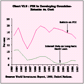 6.10 The role of relative prices and profitability of investment has been offered as an alternative explanation to the Feldstein and Horioka puzzle (Lal, 1991; Higgins, 1993; Taylor, 1994). The presence of factors such as technology and human capital can induce growth and attract capital flows to strengthen a virtuous cycle and show deviations from the Feldstein and Horioka findings. Corrected for relative prices (i.e., at domestic price of capital instead of at international price), the dispersion of the marginal product of capital across countries could be small. Disincentives to capital formation in the form of high prices of capital goods could also lower growth. Cross-country experience shows that high-income countries are generally more open to capital flows and more open economies benefit from capital flows if the internal sources of growth are strong and their past growth record is satisfactory. 6.11 In the recent period, studying the growth augmenting role of various forms of foreign capital has gained prominence over the general analysis. The findings of these studies can be conveniently grouped under the classification adopted in the analysis of the balance of payments in India. This would also reflect the current ordering of capital flows by type from the point of view of the policy stance (Reddy, 1998). Foreign Direct Investment 6.12 Capital flows in the form of FDI have been widely believed to be an important source of growth in recent years. Since the 1970s, imperfections in goods and factor markets, presence of scale economies and government restrictions on output, trade and entry have come to be recognised as creating market structures where foreign capital in the form of FDI contributes to growth (Kindleberger, 1969; Hymer, 1976). It is eminently plausible that FDI flows might not have existed but for the presence of these imperfections. The theories of international resource allocation based upon the spatial distribution of factor endowments suggest the importance of 'locational advantages' as a key driver of FDI flows while the theories of organisation point to the role of 'ownership advantage' and the advantage of 'internalising intangible assets (like technology, brand name and marketing skills)'. Competitive policies of nations to attract FDI often work towards reducing the cost of production in a host country. Favourable tax treatment, protected domestic market and low labour costs represent the primary pull factors for FDI. Sound policies, strong and resilient financial systems and liberal exchange control norms also help in creating the congenial environment for augmented inflows under FDI. 6.13 Growth impulses originating from FDI are primarily ascribed to superior technology and greater competition that generally accompany FDI. Local firms of many developing host countries also do not invest enough on R&D to offer and sustain competition with Transnational Corporations (TNCs). Investment on R&D by TNCs in foreign affiliates is, however, found to be low, accounting for as little as 1 per cent of the total R&D investment even though TNCs are generally viewed as R&D intensive (UNCTAD, 1999). Despite the usual concerns that inappropriate technology is generally transferred to the foreign affiliates, empirical assessments suggest that technology - both public and private - that accompany FDI are complementary and inter-firm collaboration helps in augmenting growth. The public knowledge component of technology, representing blueprints and designs that can be codified in manuals and handbooks, can be transferred to the host country depending on the speed at which it is imitated and adapted by other local firms for development of local skills. The private part of the technology that is internalised by the parent, represents a key source of productivity differential across firms. In such cases also FDI may augment growth in a country if its initial technology gap is higher and openness to FDI is significant. 6.14 Whether FDI promotes competition or facilitates development of oligopolistic structures depends upon whether FDI crowds-out or crowds-in domestic investment. FDI can potentially displace domestic producers by preempting their investment opportunities. It is possible, however, that the adverse growth effect emanating from crowding-out could be more than offset by the increase in productivity resulting from advanced technology that often accompanies FDI. Whenever the technology is externalised, it may be transferred at a higher cost since it involves unbundling the package that FDI represents. FDI policies generally take into consideration the conditions that could crowd-in domestic investment. It is the attractiveness of the package that has expanded the appeal of FDI despite the fact that it could be one of the costliest forms of capital for a developing country (Chart VI.9).